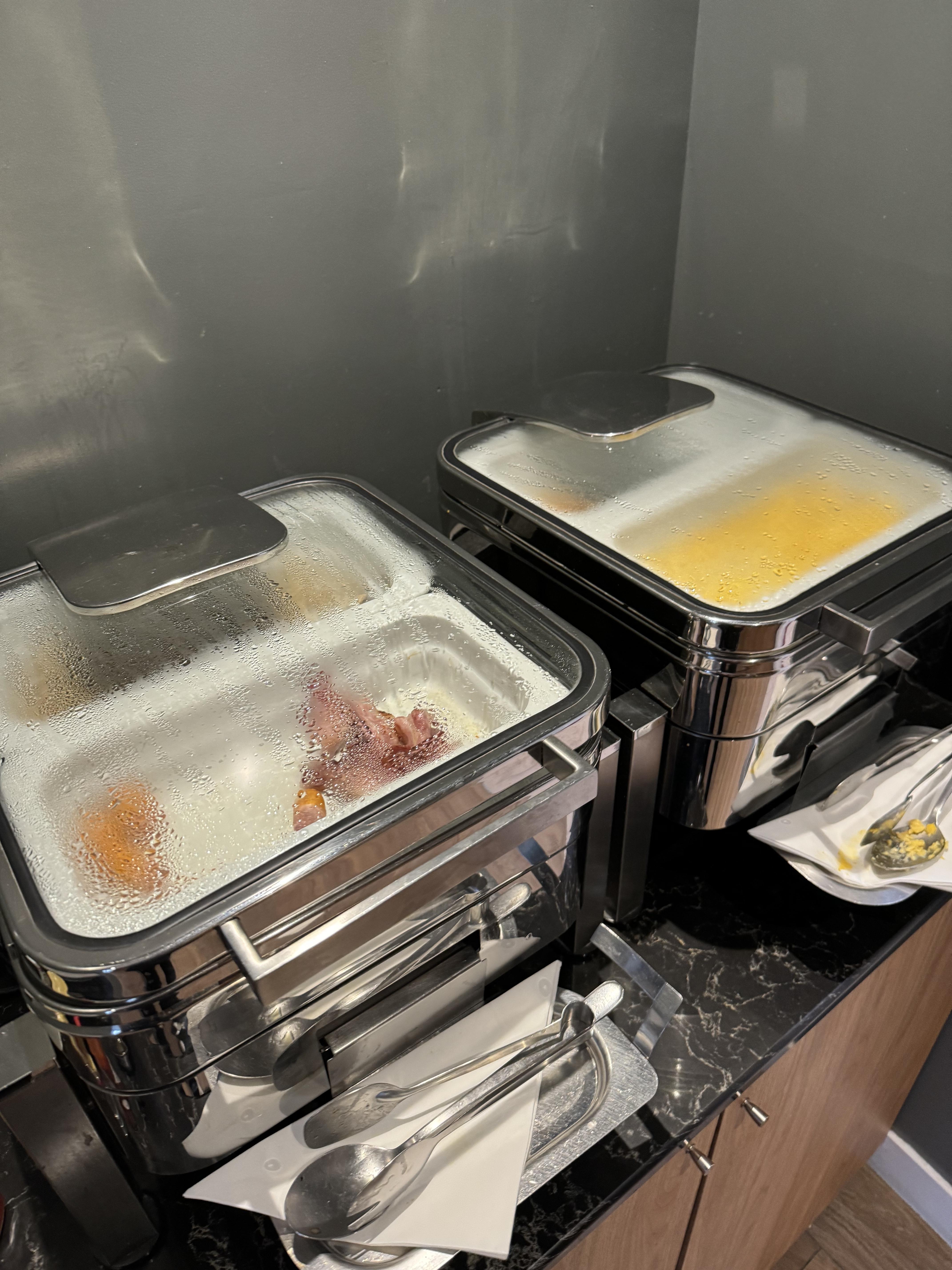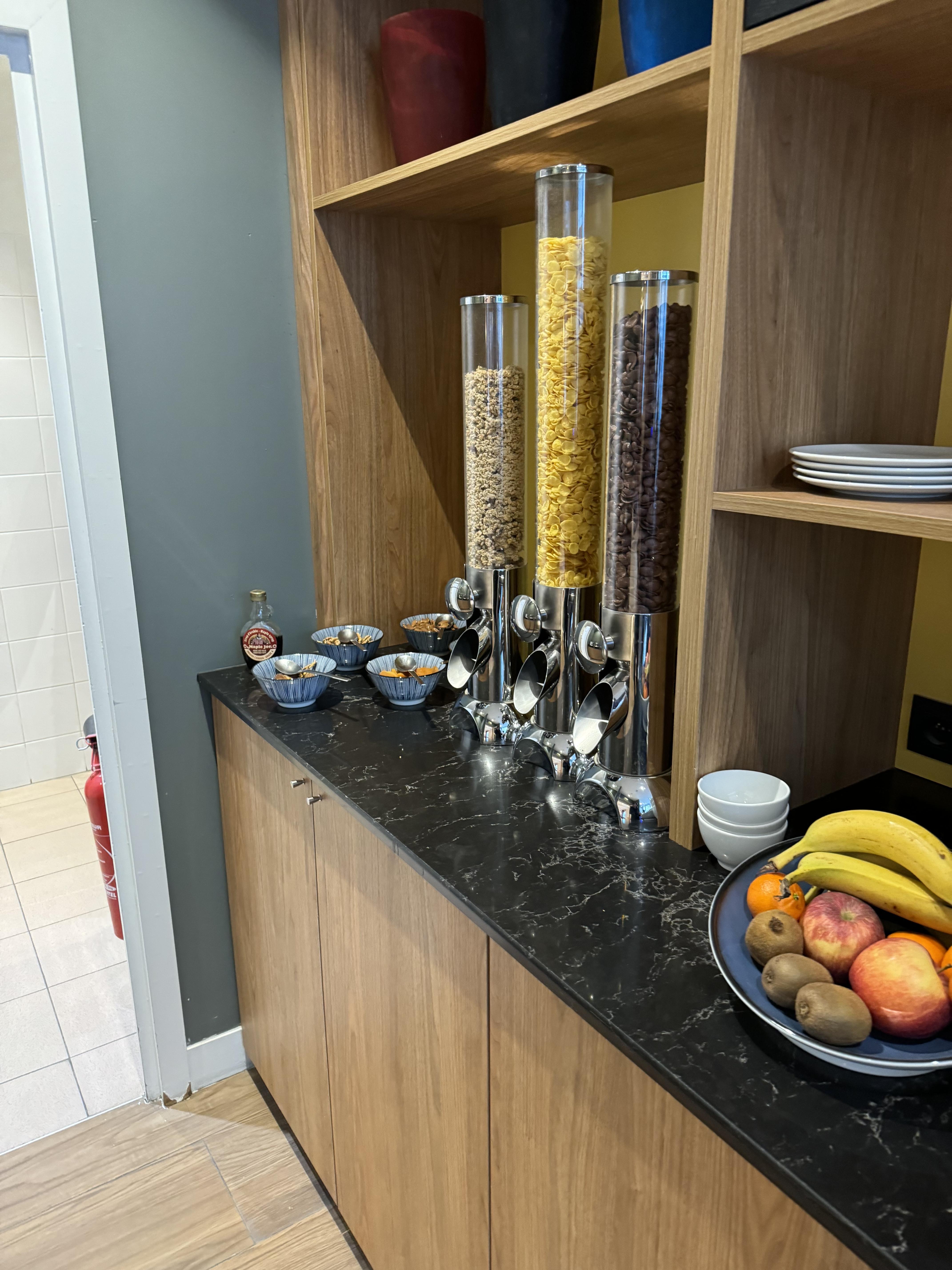 시리얼, 빵, 베이컨, 스크램블에그, 연어정도 있고, 우유나 주스, 요거트, 과일도 있구요.