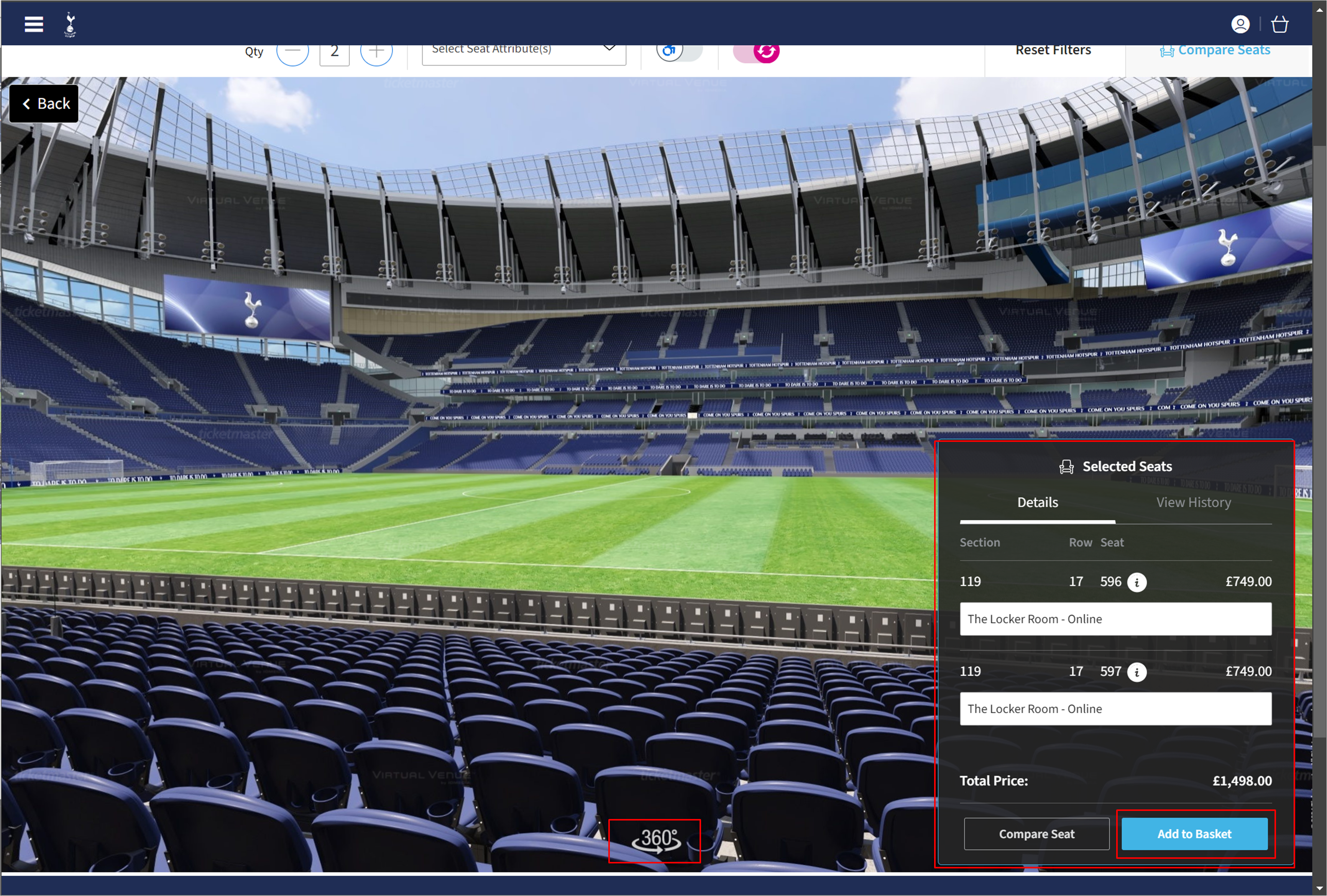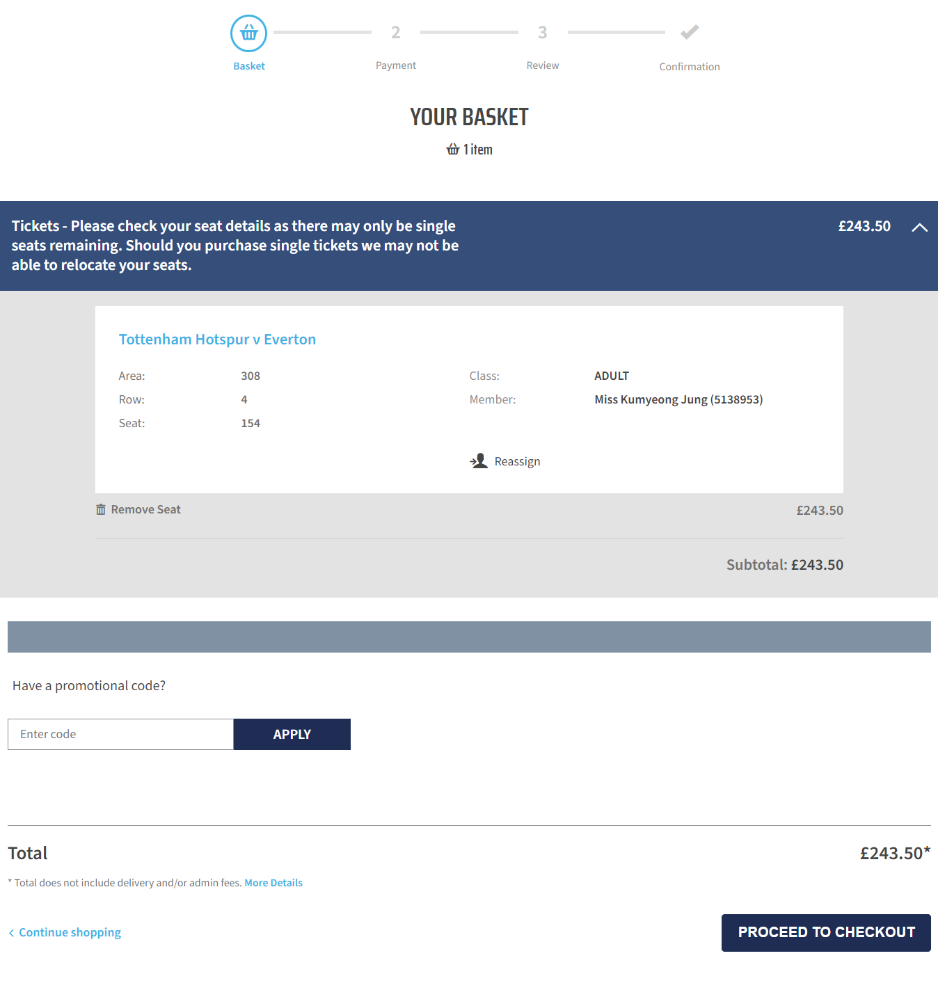 선택한 좌석이 마음에 들면 Add to Basket 버튼을 눌러 장바구니에 넣습니다.