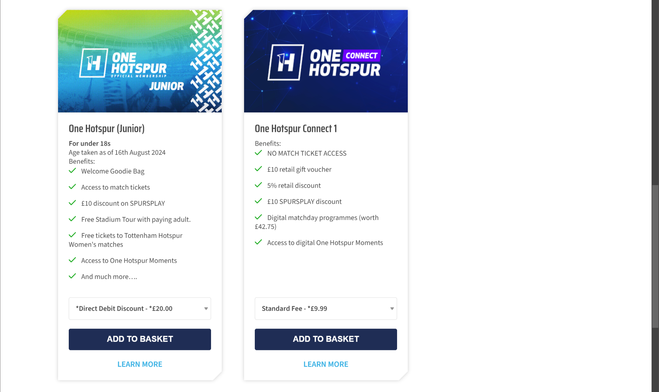 멤버십 종류는 이렇게 다섯가지가 있는데, 저는 One hotspur Adult 멤버십으로 가입했습니다.