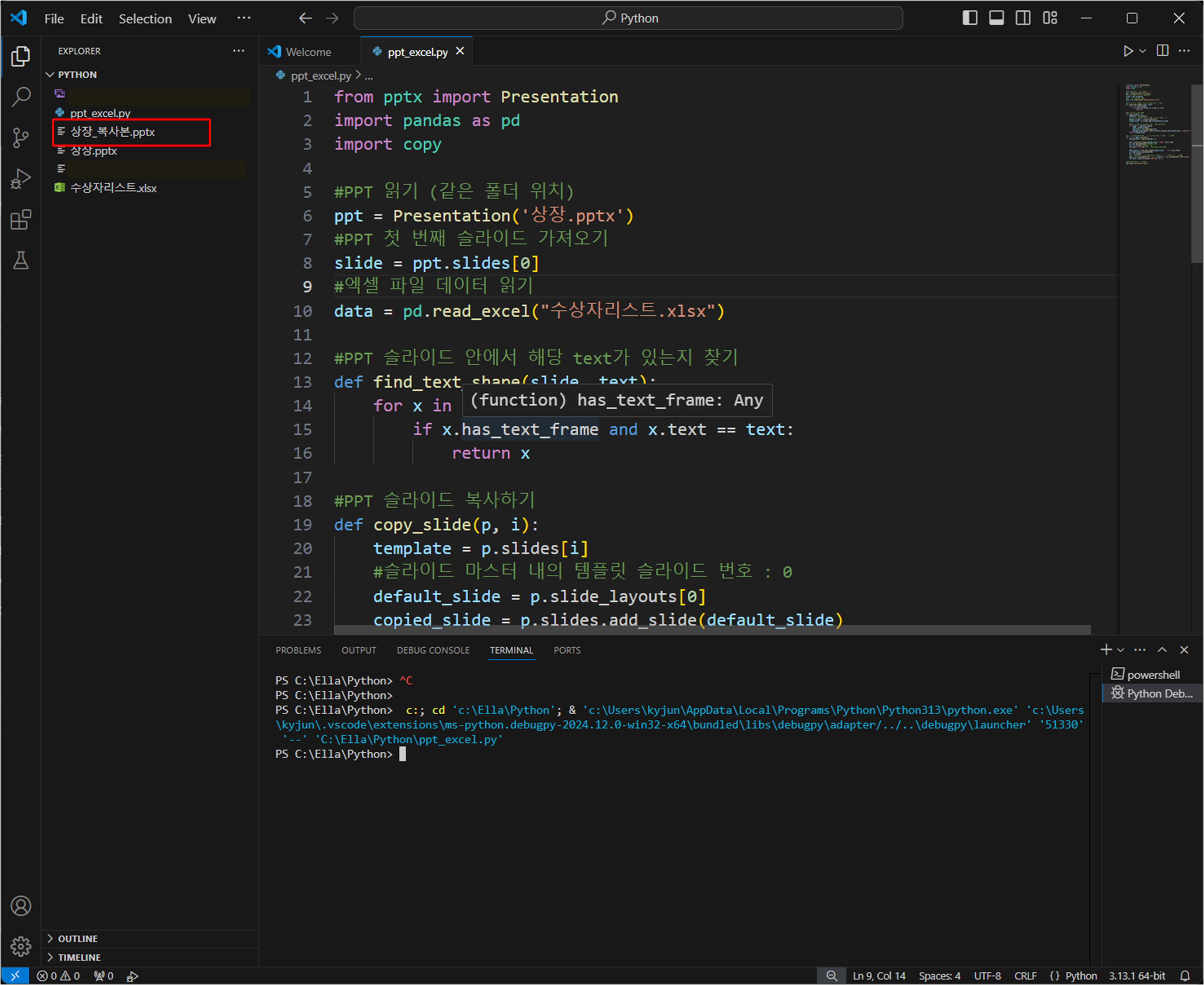 간만에 우리 윰교수님 부탁으로 파이썬을 해봤어요🤣학생들 상장을 만들어야 하는데 학생리스트는 엑셀로 있고 상장템플릿은 PPT로 되어 있다면서,학생 수가 몇백 명이 넘는데 어떻게 하는지 아냐고 물어봐가지고,제가 아는 자동화방법으로 해봤습니다 ^^엑셀 매크로도 물론 조금은 알지만, PPT에도 매크로 같이 자동 채우기가 되나요...?아시는 분....??😅 아무튼,,ㅎㅎ파이썬을 이용해서 Excel을 읽고, PPT에 적용해 보겠습니다. VSCode에서 Python 사용하는 방법은 아래 링크 참고해 주세요 : ) [Python] 파이썬 다운로드 VSCode 파이썬 실행환경 만들기 (2024.12)📌 파이썬 다운로드 ** 다운로드 링크 ** Download PythonThe official home of the ..