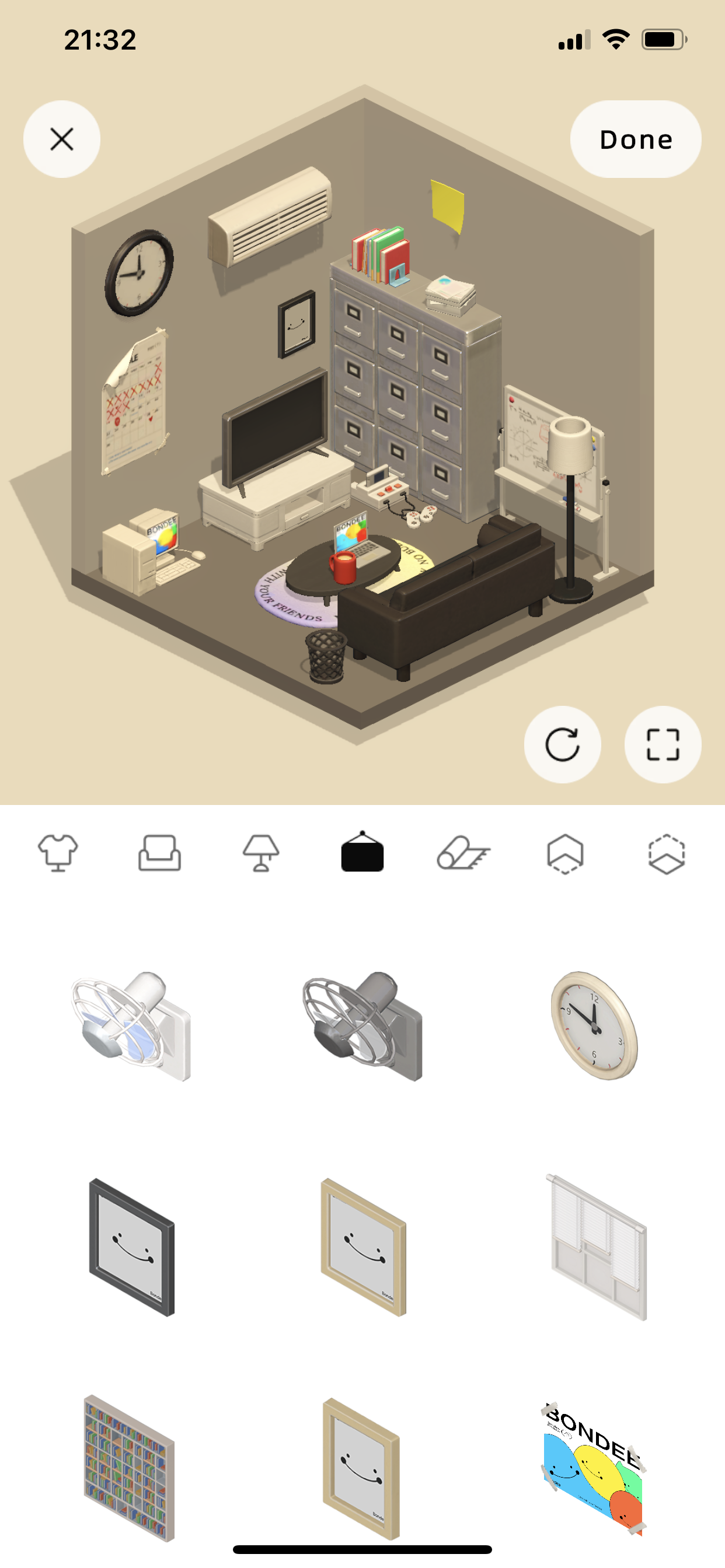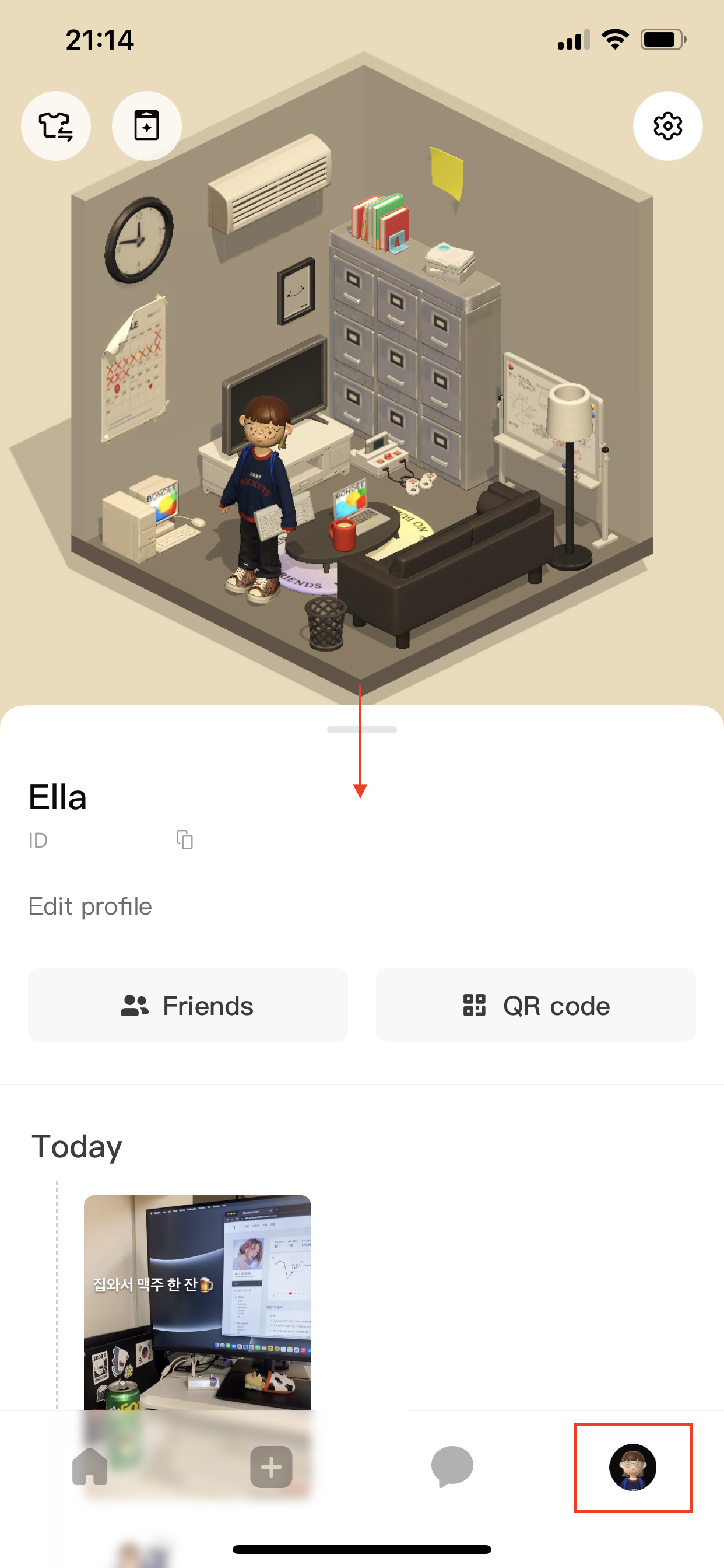 아바타 꾸미기를 완료하고 하단 맨 우측 메뉴에 가면 내 방이 나오고, 거기서 방을 꾸밀 수 있습니다.