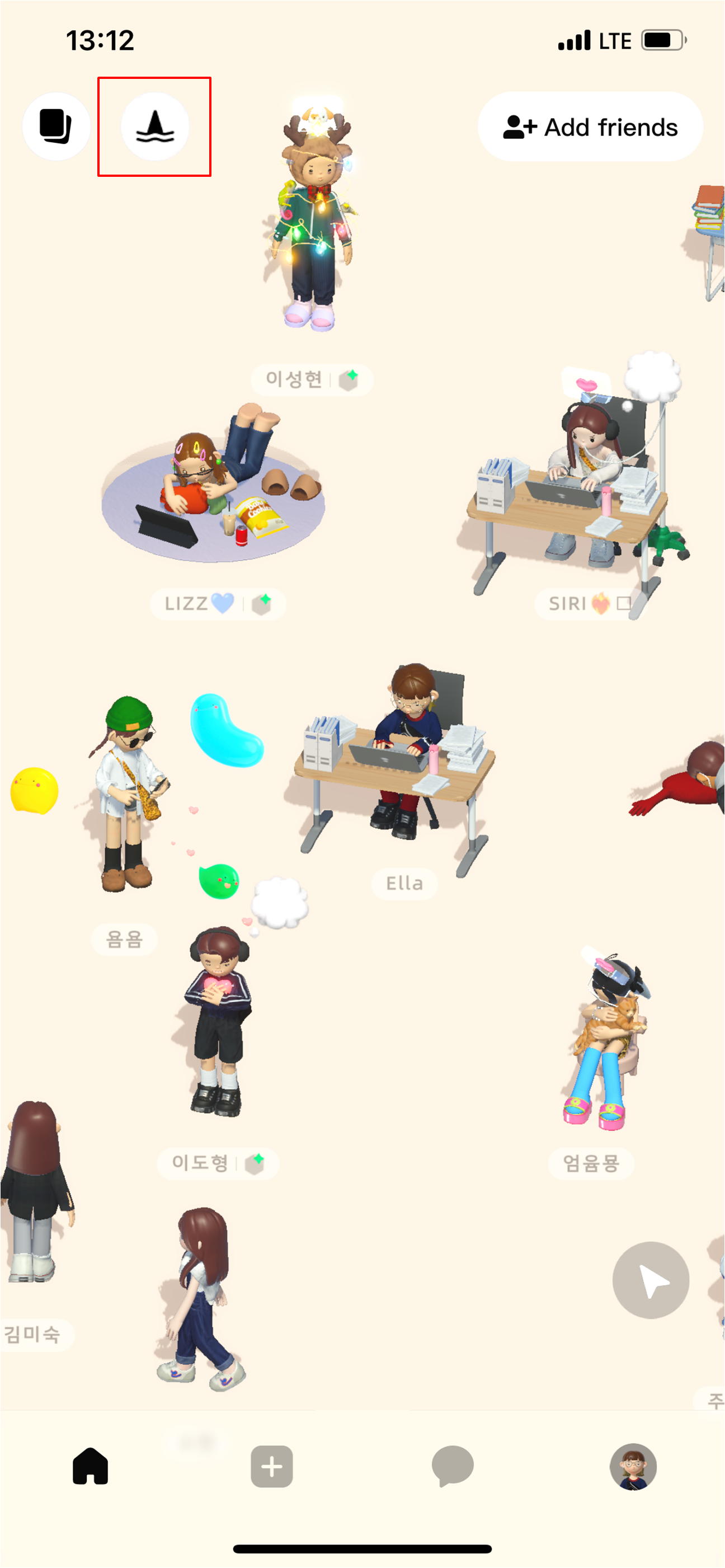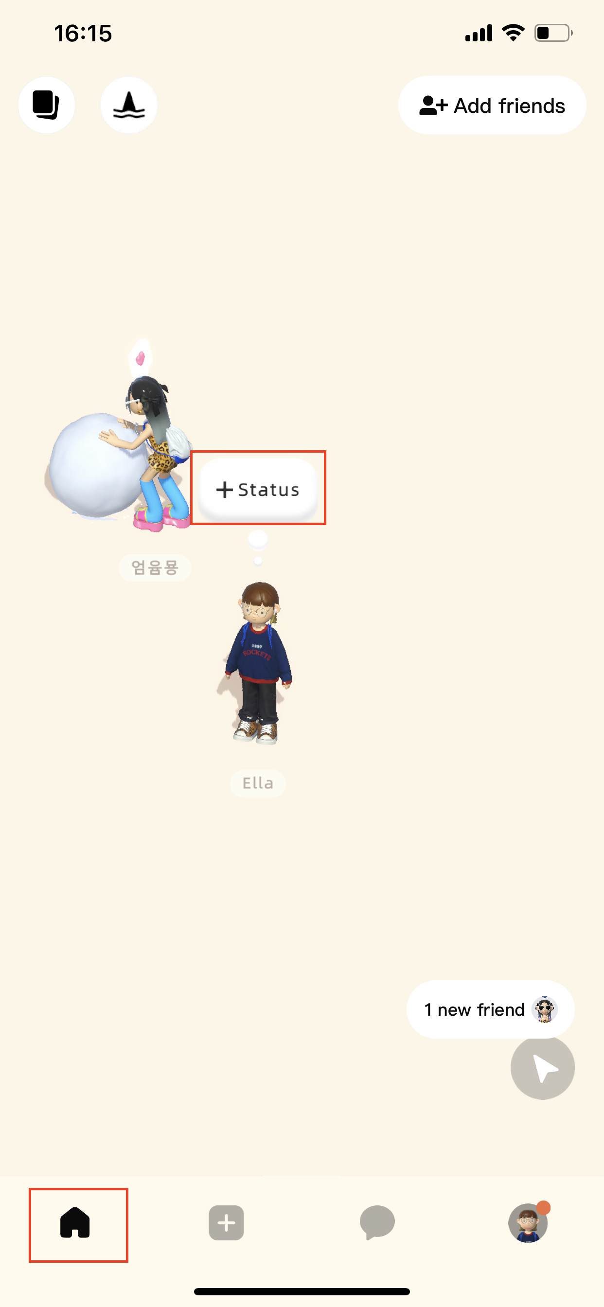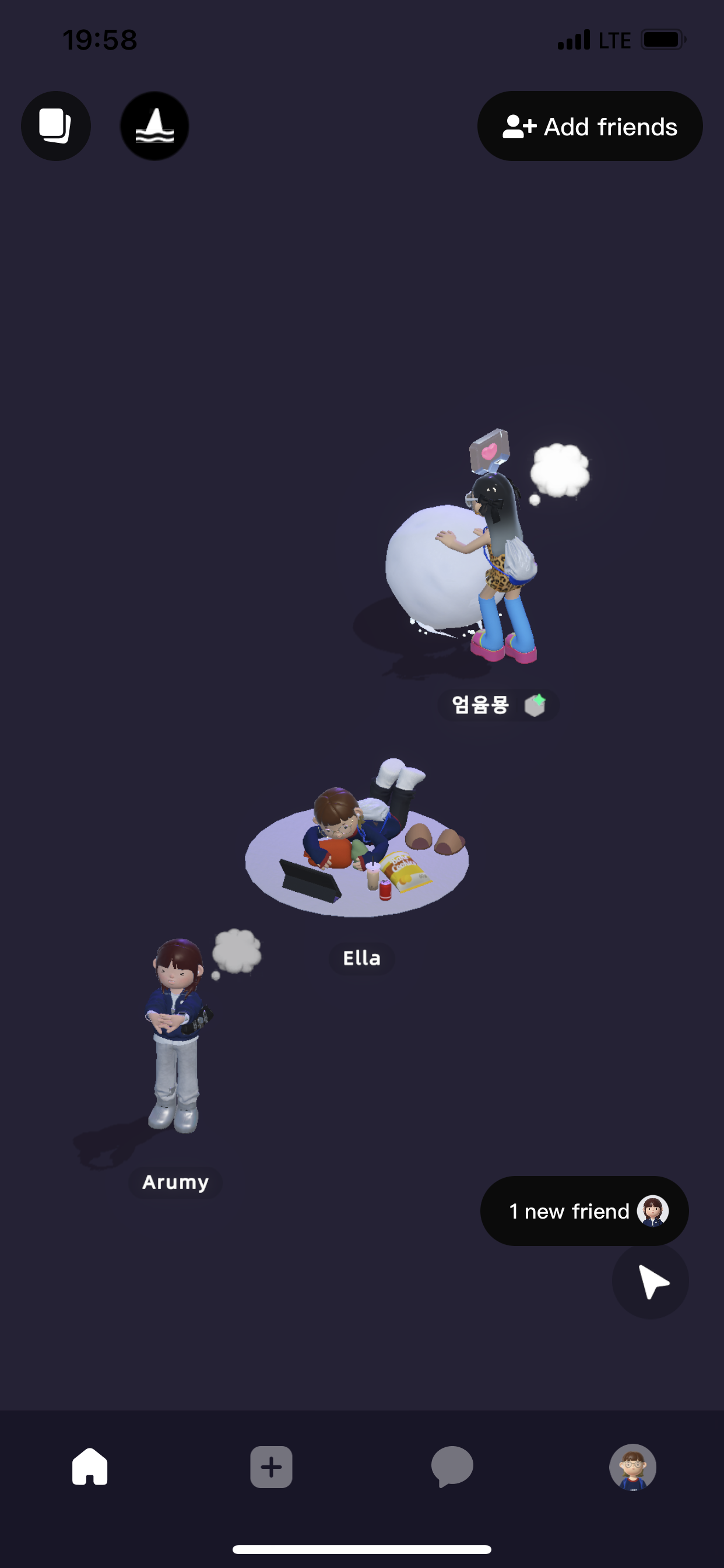 앱 홈 화면에는 저와 친구들이 돌아다니고 있습니다. 이때는 아직 친구가 한 명밖에 없었어요 ㅋㅋ