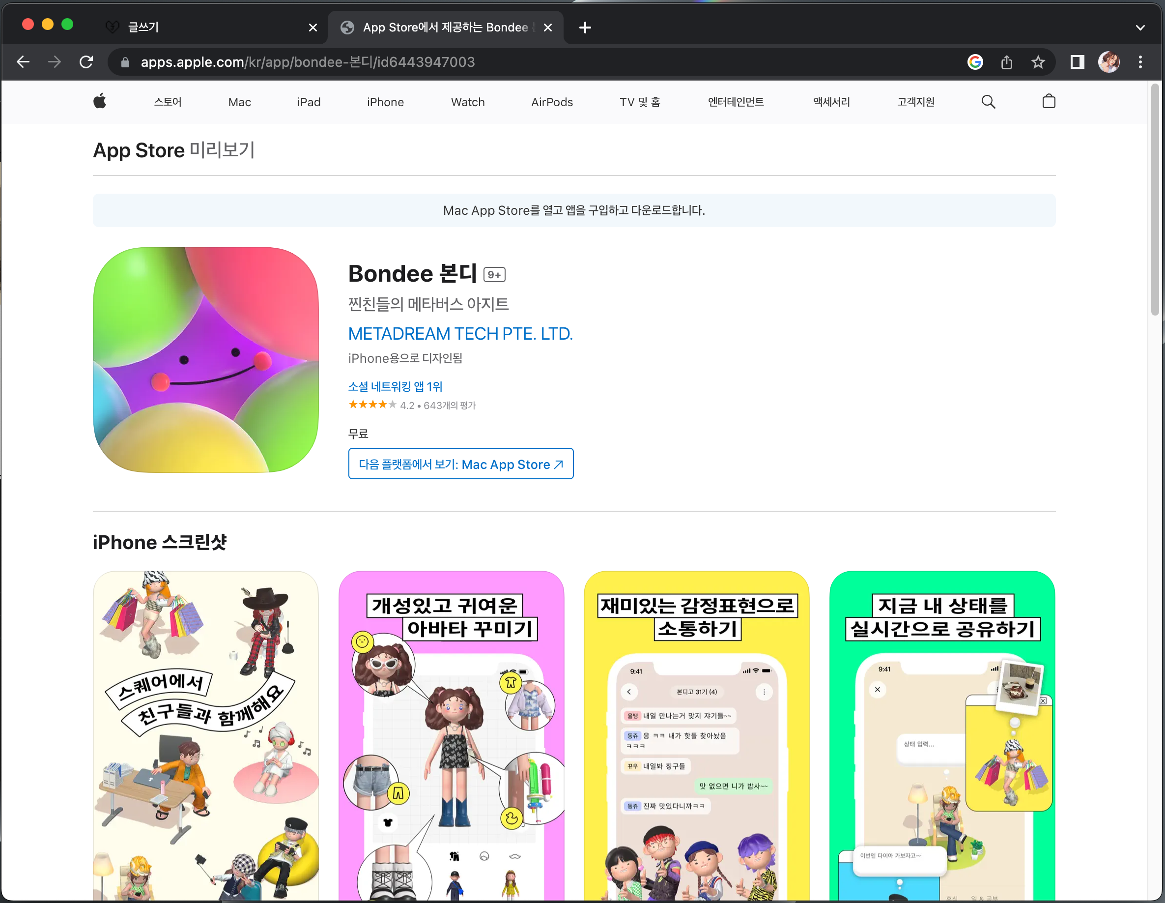 이게 알고 보니깐 Bondee 본디라는 어플이고, 현재 앱스토어에서 다운로드 순위 1위를 차지하고 있었습니다.