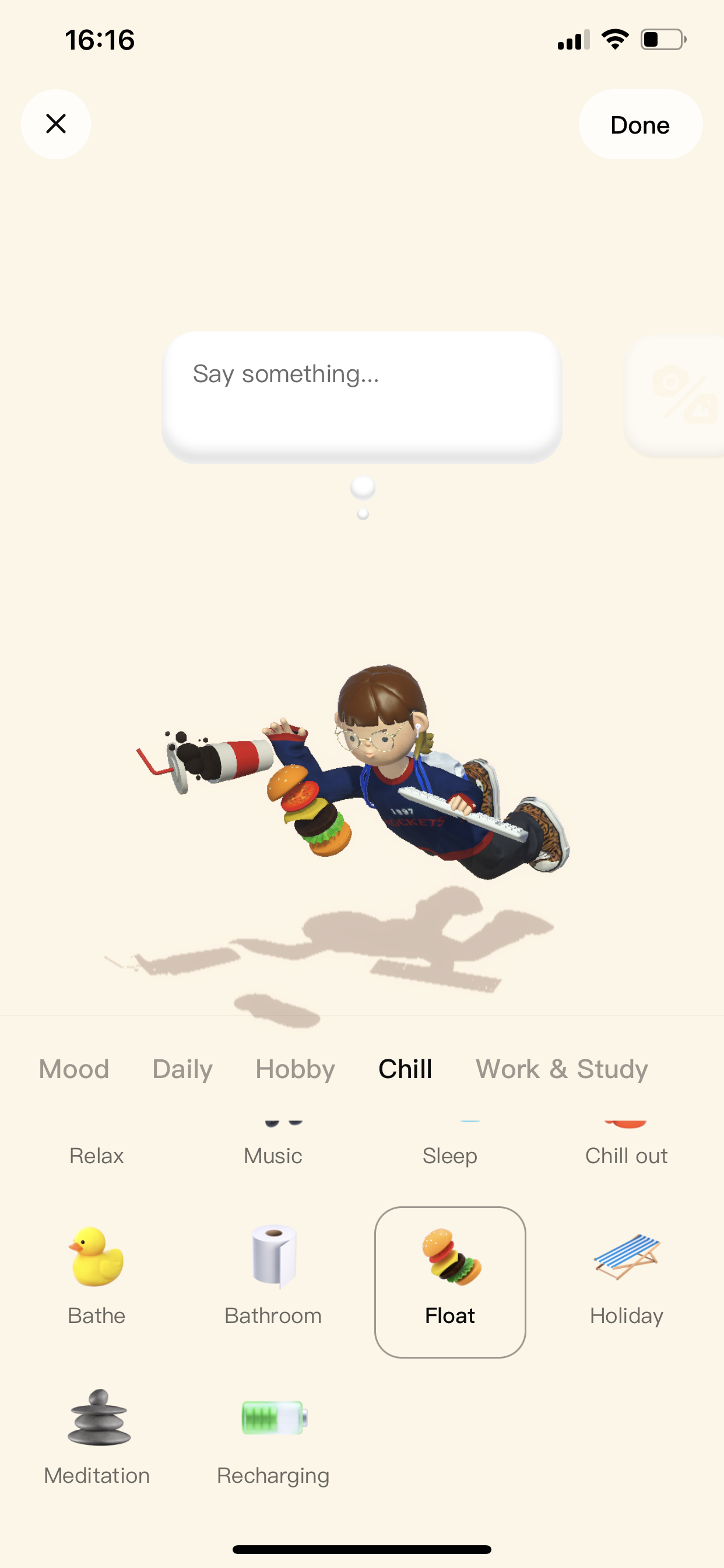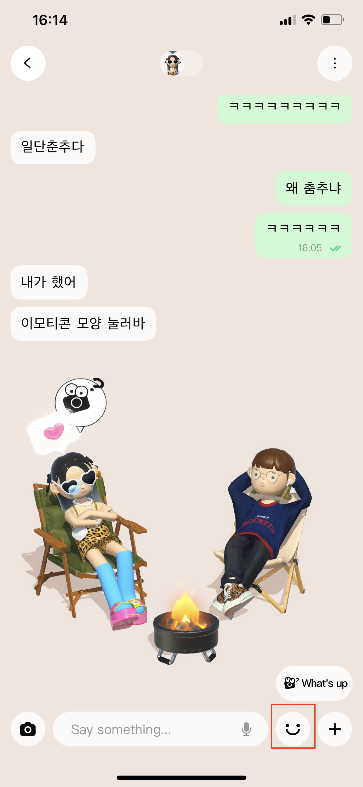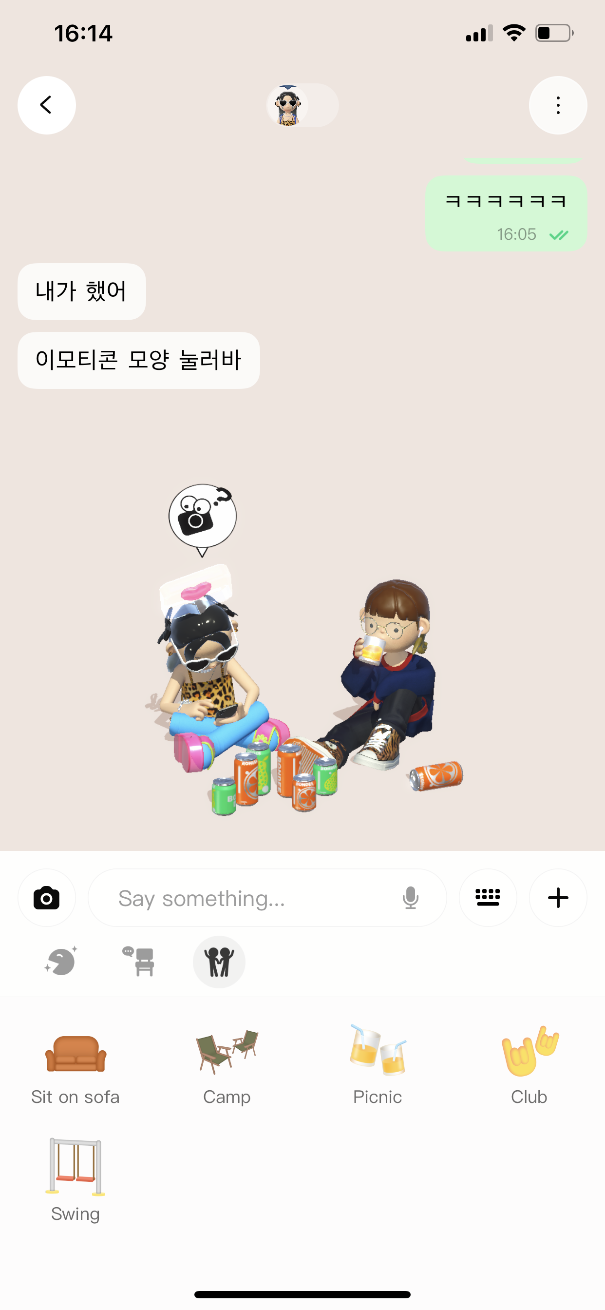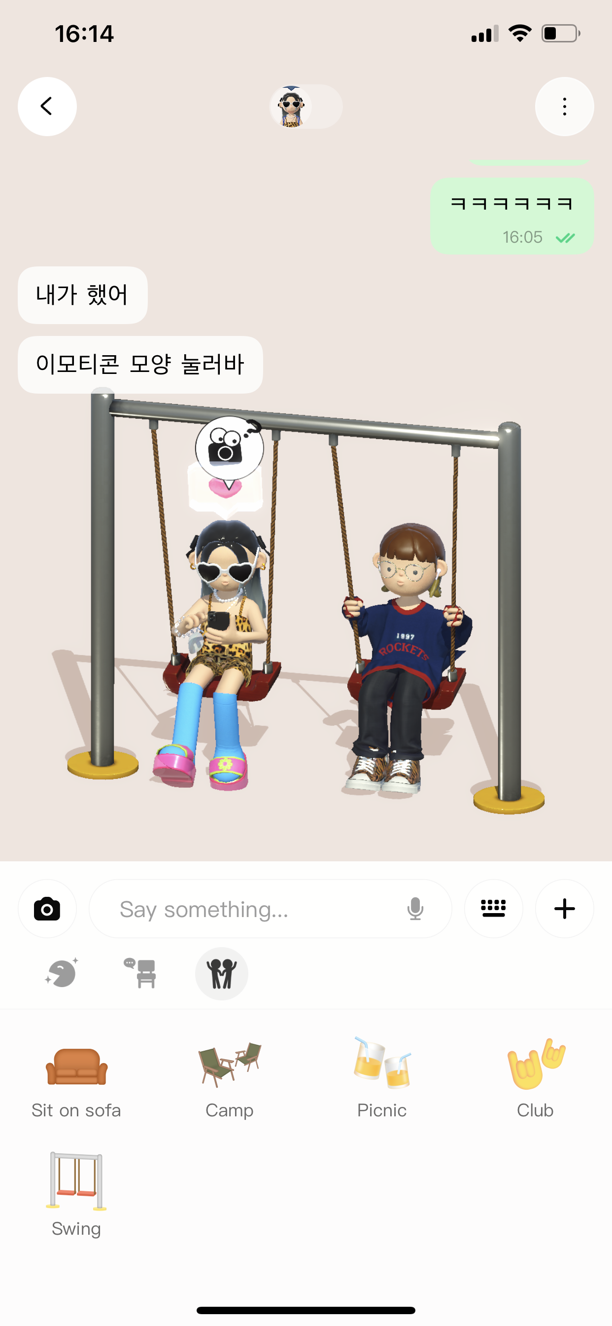 채팅방에서 내 아바타 감정표현도 할 수 있고, 친구 아바타랑 놀 수도 있더라고요 ㅎㅎ 핵졸귀 ㅎㅎ