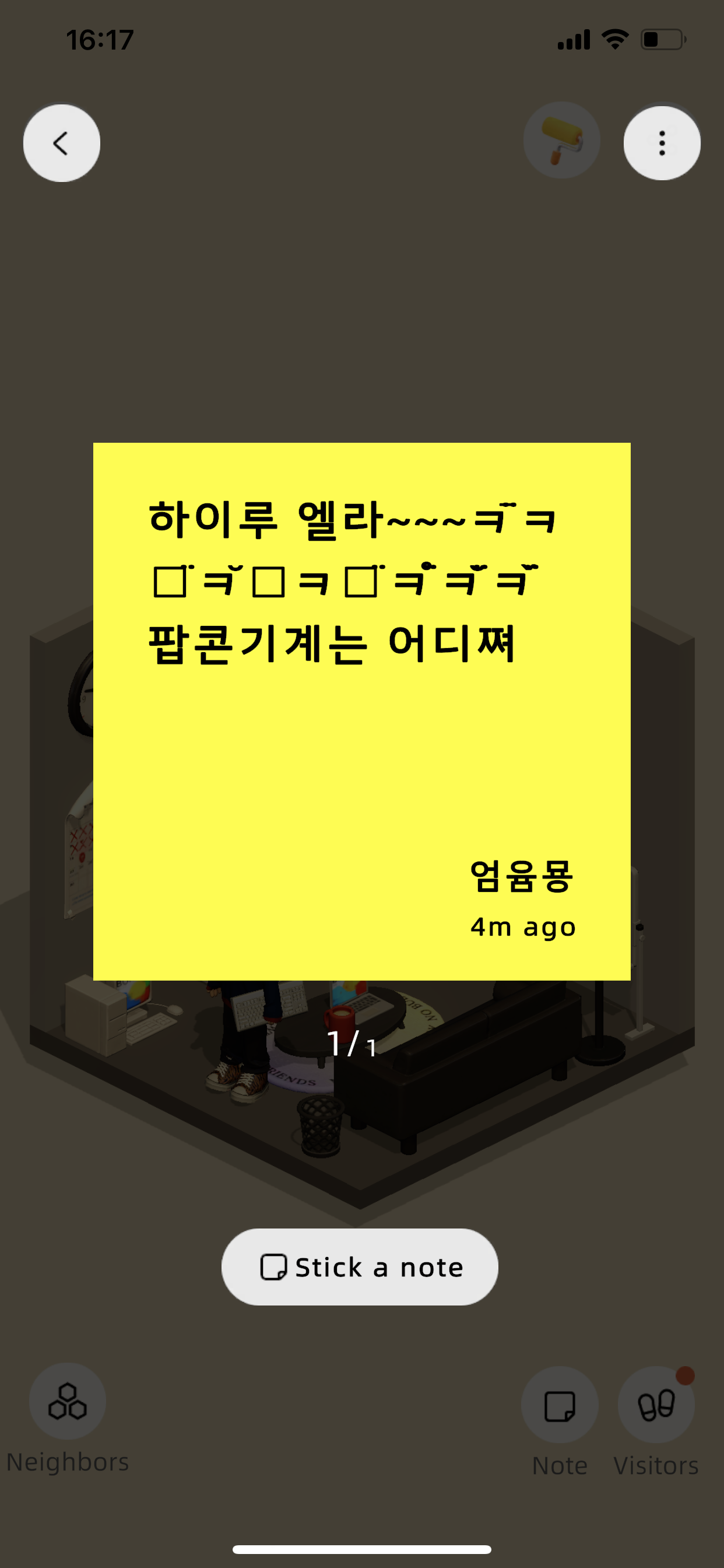 요거는 제 방인데요, 친구들이 제 방에 놀러 와서 노트를 남기고 갈 수 있습니다.