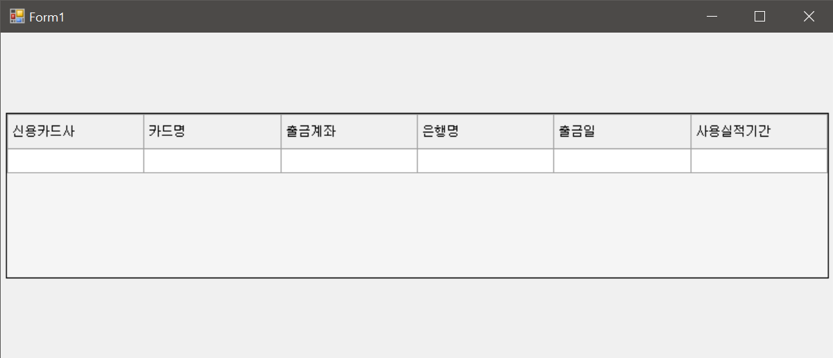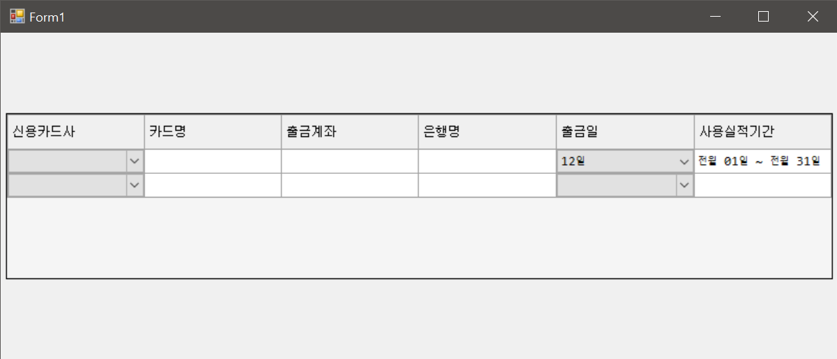 2. 생성한 ComboBoxCell을 가지는 DataGridViewColumn을 만들어 현재 dataGridView1에 0번째 Column으로 추가한다. 3. 기존 0번째 Column은 1번째로 밀리기 때문에, 기존의 1번째 '신용카드사' 컬럼 데이터를 추가한 ComboBox Column으로 복사한다.
