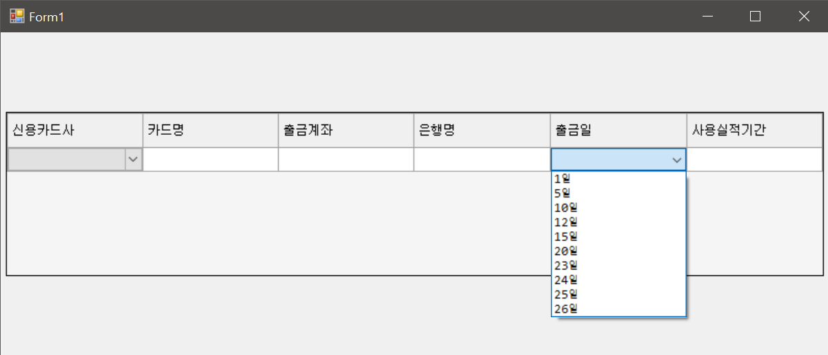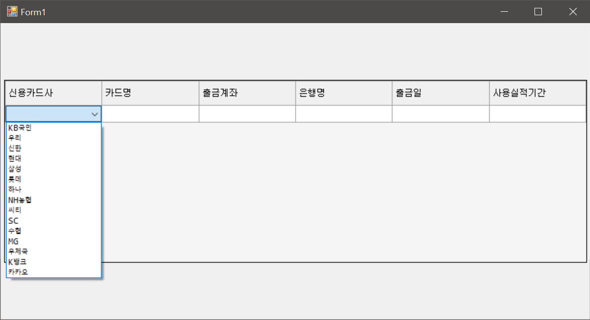1. DataGridViewComboBoxCell을 만들고, 신용카드사 리스트를 ComboBox 아이템으로 추가해 준다.