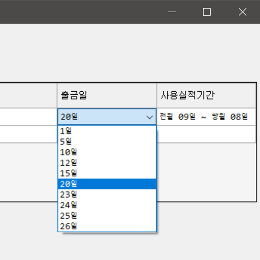 이번엔 출금일 ComboBoxCell을 만들어서 출금일에 따른 사용실적기간을 자동으로 입력하고 싶다.