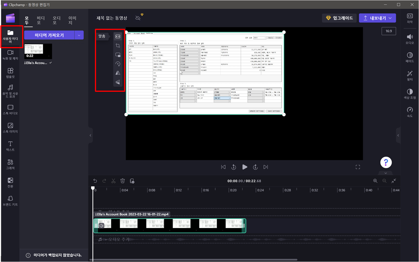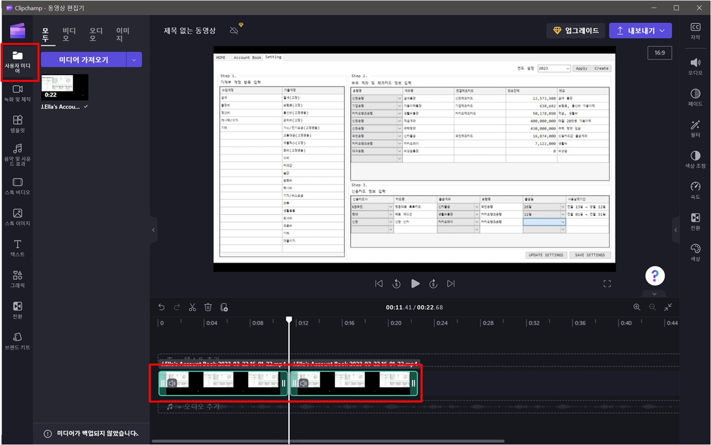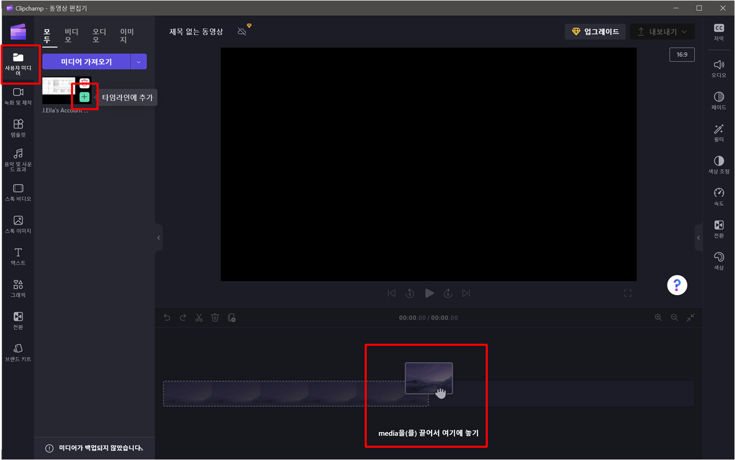 가져온 동영상을 타임라인에 추가합니다.