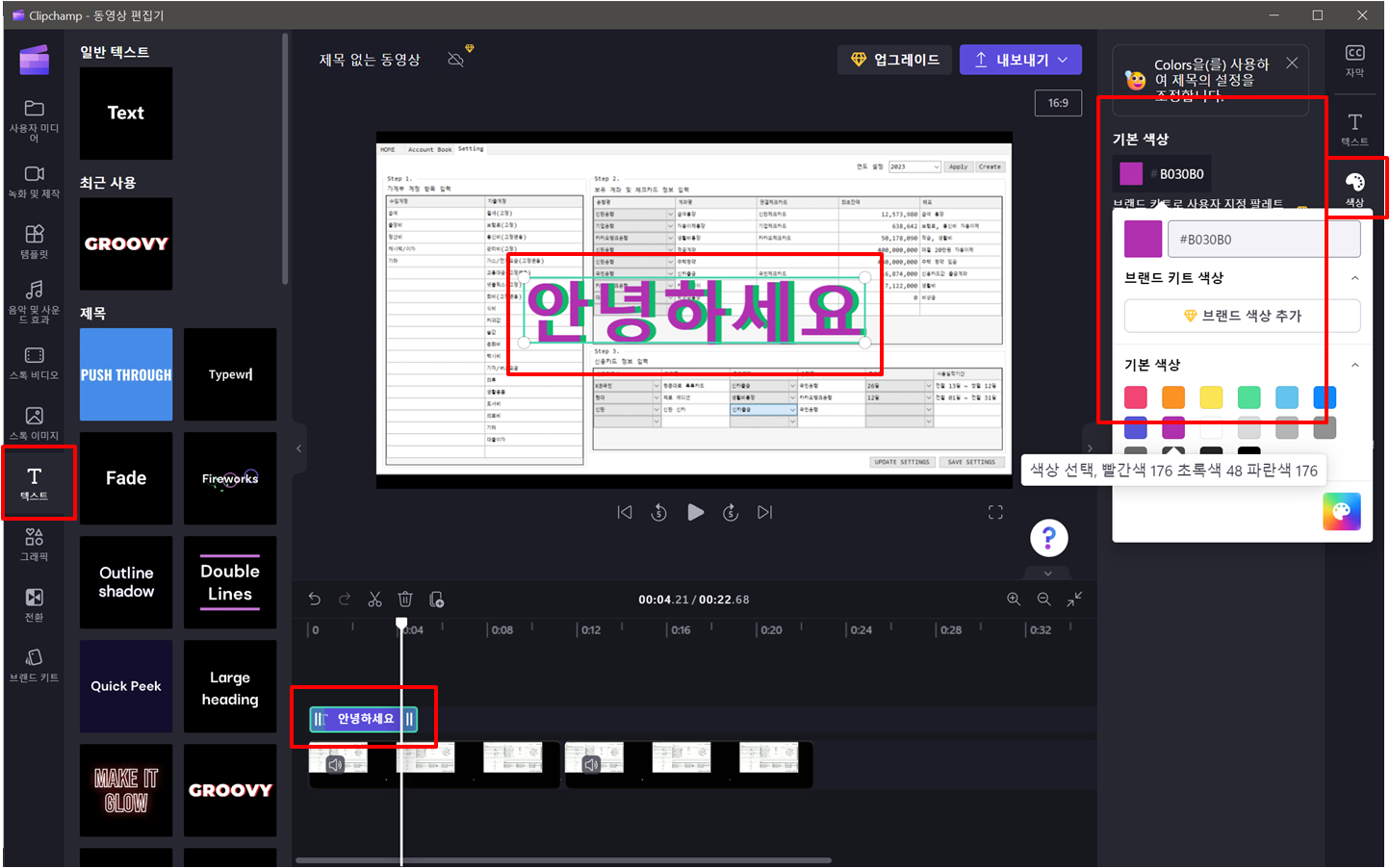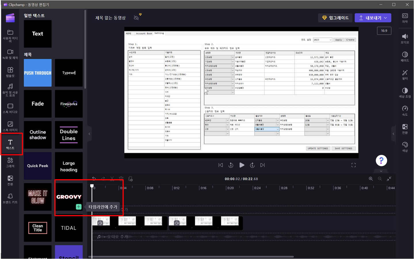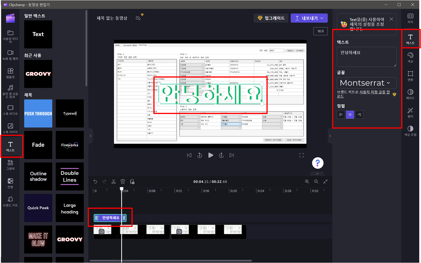왼쪽의 텍스트 메뉴에서 텍스트를 추가할 수 있습니다.