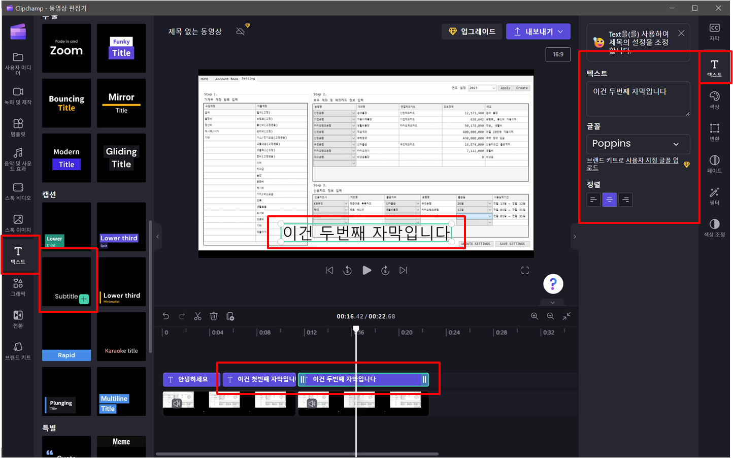 왼쪽 텍스트에서 Subtitle 메뉴를 타임라인에 추가하고 글씨를 변경합니다.