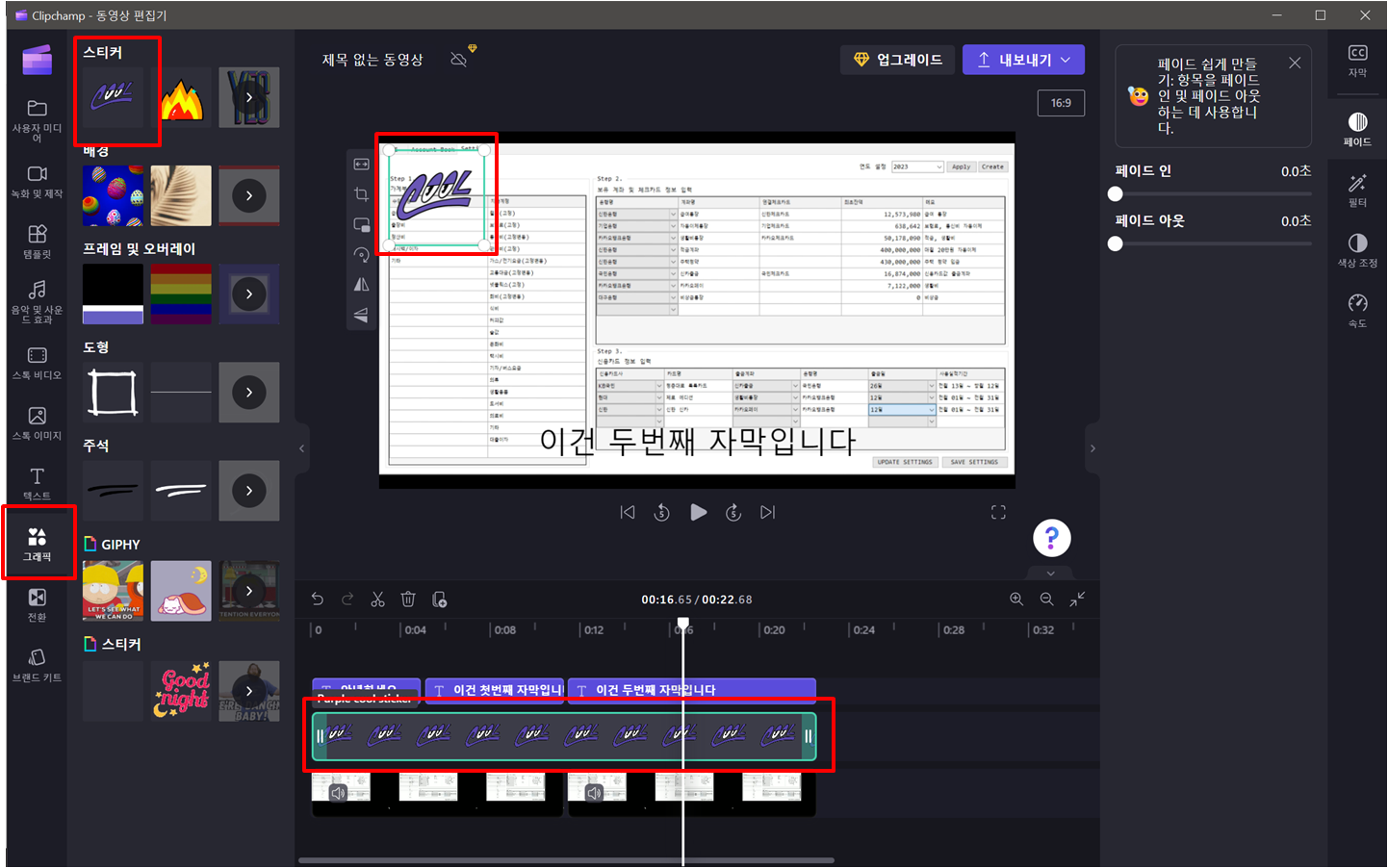 왼쪽 그래픽 메뉴에서 스티커를 추가할 수 있습니다.