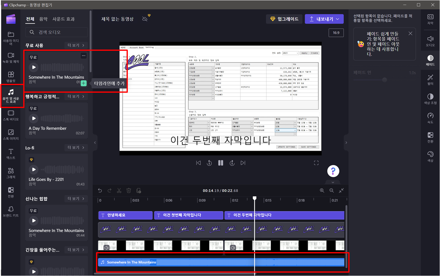 음악 및 사운드 효과 메뉴에서 무료로 제공되는 음악을 추가할 수도 있습니다.