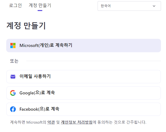 계정은 편하신 대로 Microsoft 계정이나 구글 등 여러 계정으로 만들 수 있어요.