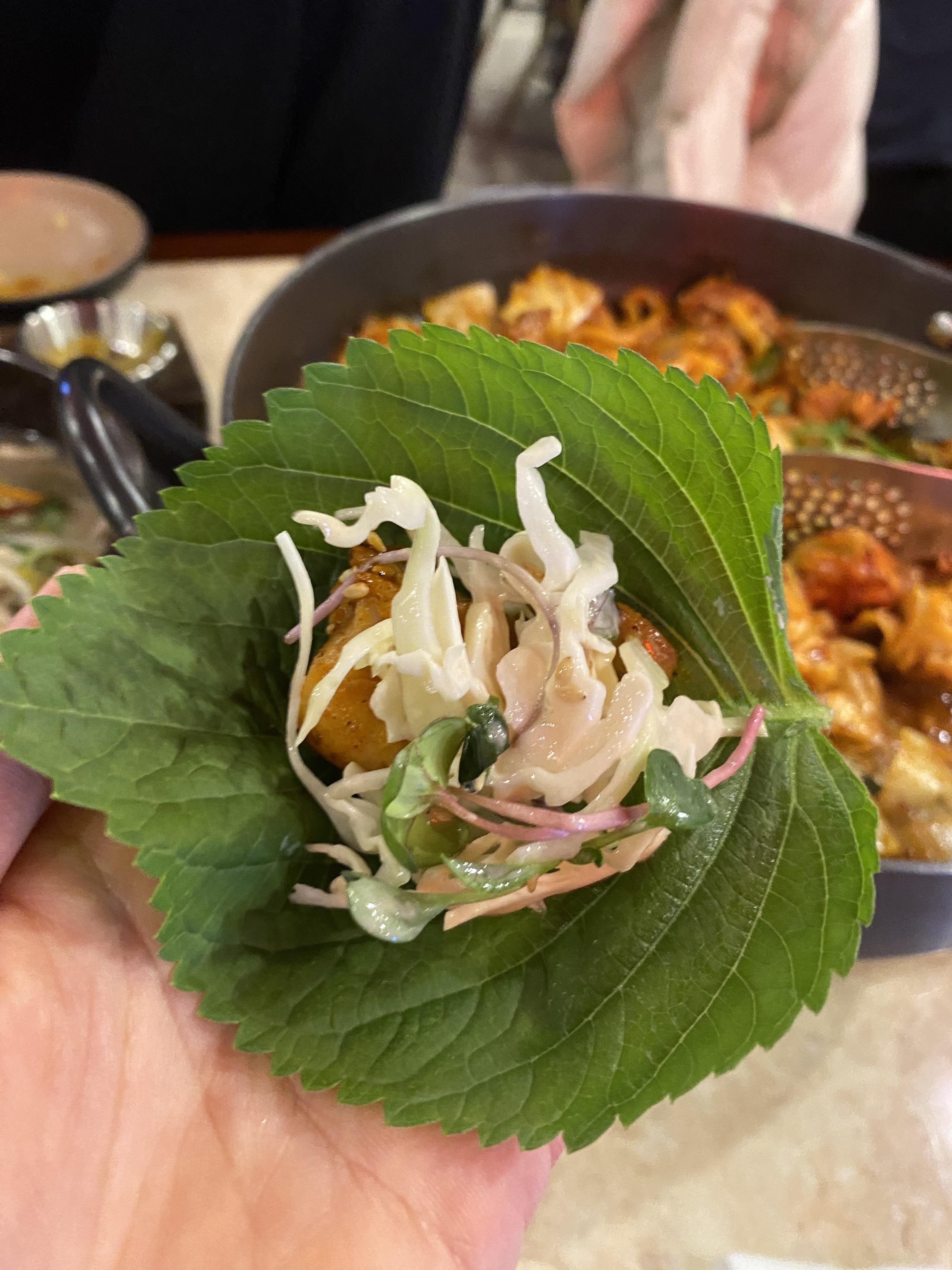 마지막 사진은 직원분이 추천해 주신 대로 깻잎에 닭갈비랑 샐러드랑 같이 넣어서 먹어봤습니다. ㅎㅎ