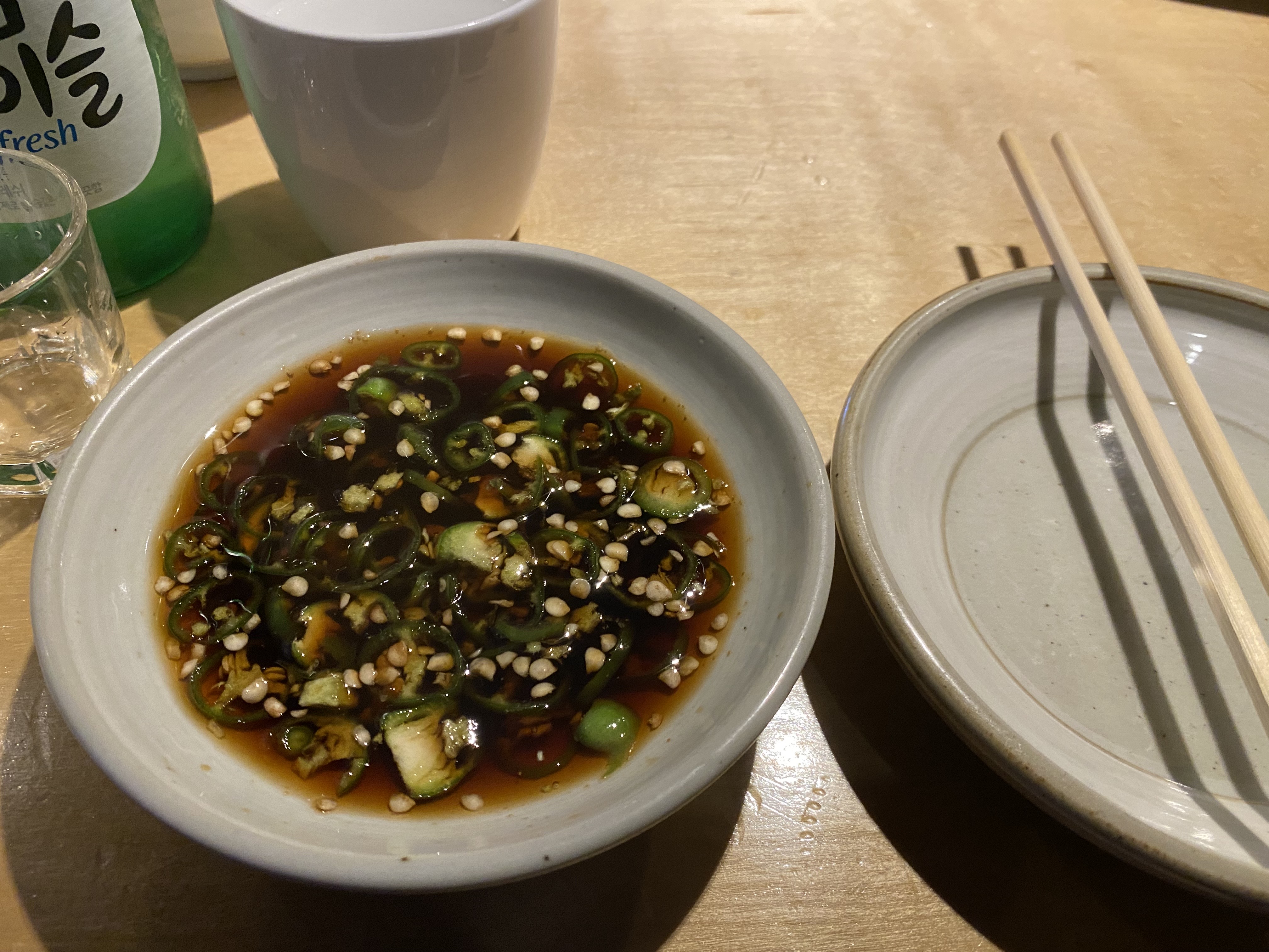 고기가 나오기 전에 간장에 고추를 좀 재워놓고,, ㅎㅎ