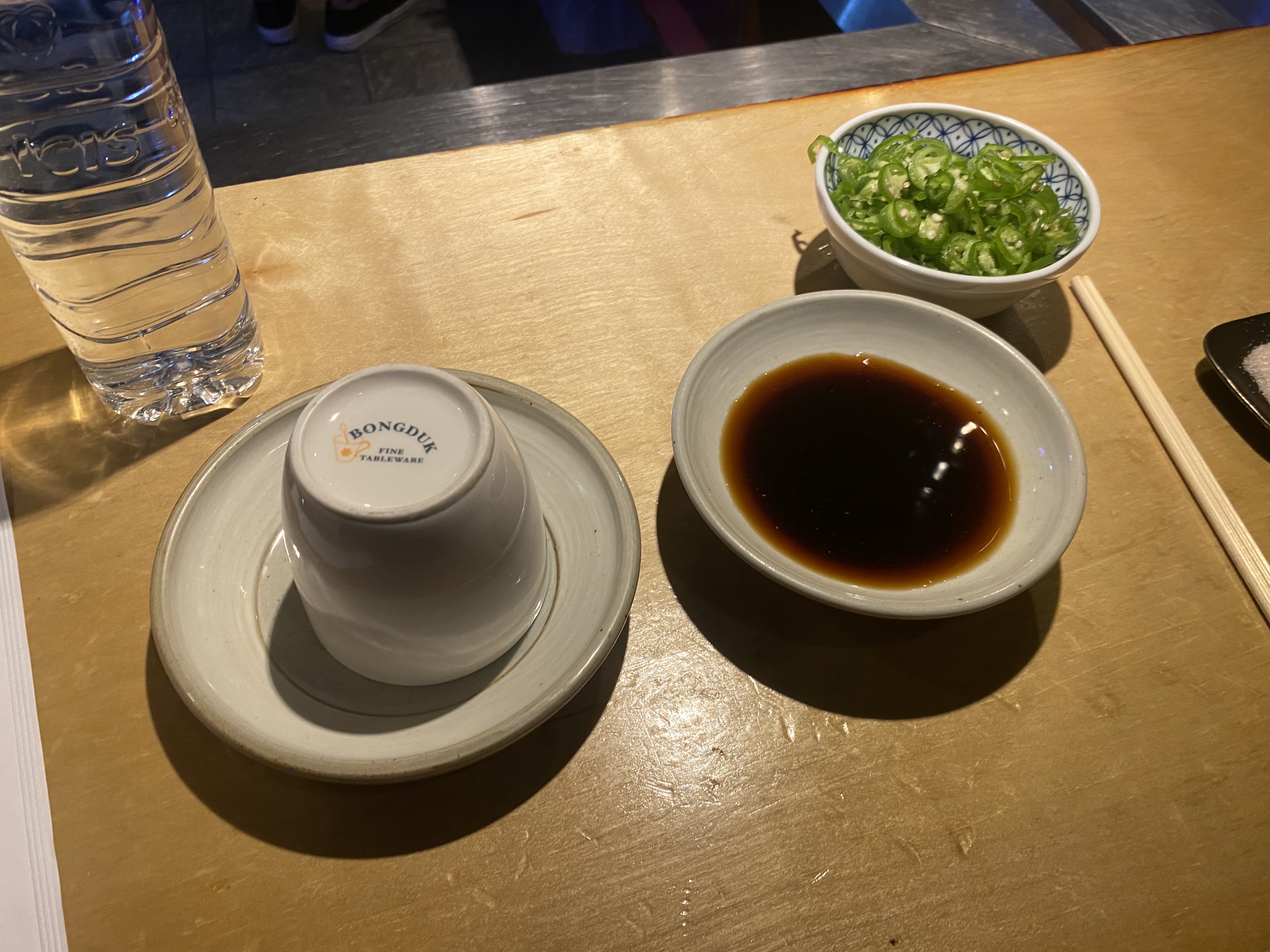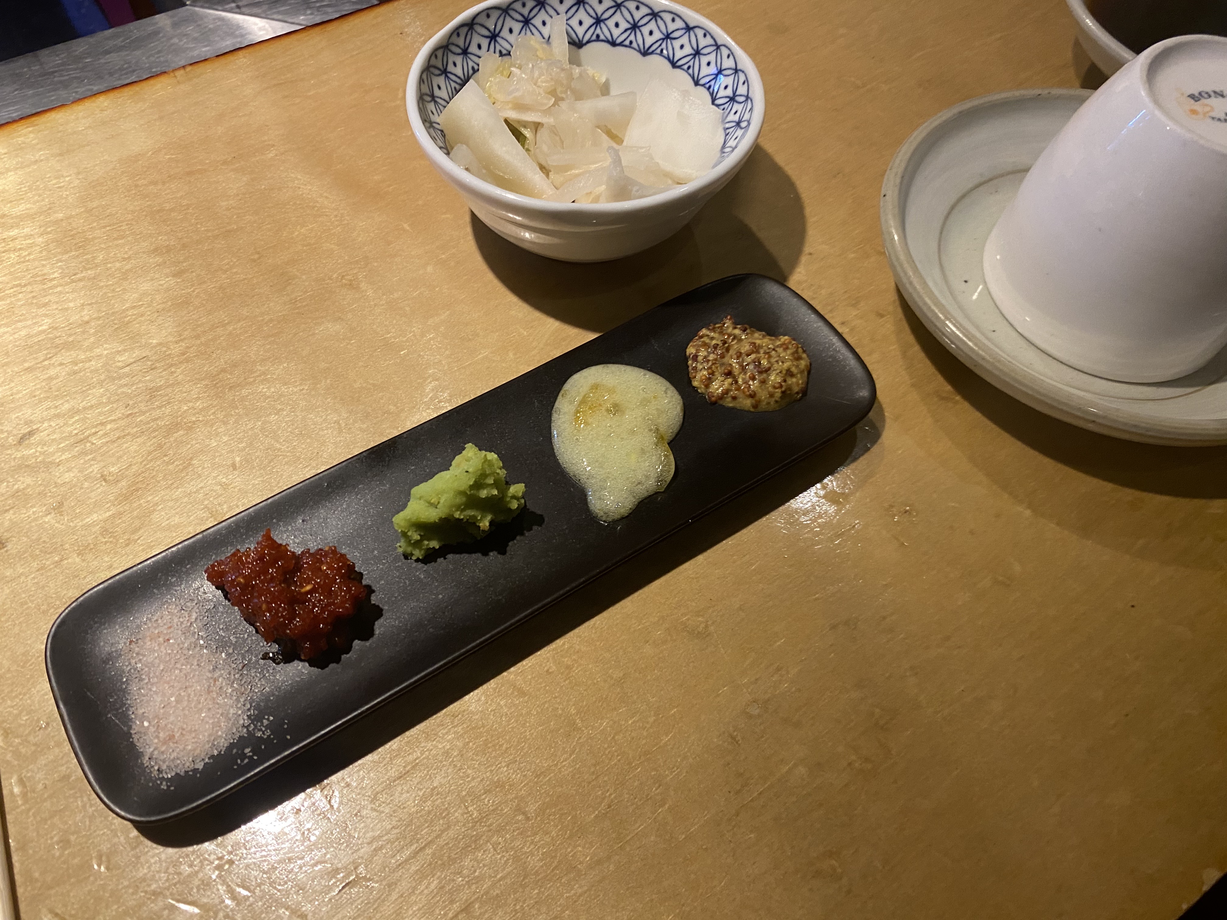 기본으로 나오는 소스는 핑크솔트, 양념젓갈, 와사비, 유자와사비, 홀그레인 머스타드가 제공됩니다.