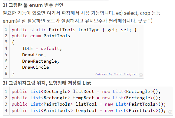 이전 포스팅에 보면 이렇게 PaintTools enum이 있고, 4개의 List로 그림 정보를 저장했습니다.