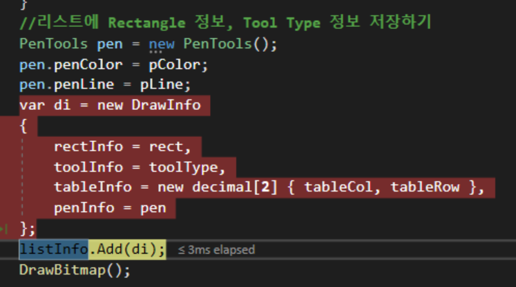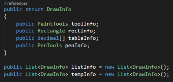 이렇게 되면 DrawInfo 구조체에 모든 정보들이 들어가고, 현재 정보 list와 실행취소 시에 사용할 temp 딱 두 개의 List로 관리할 수 있습니다.
