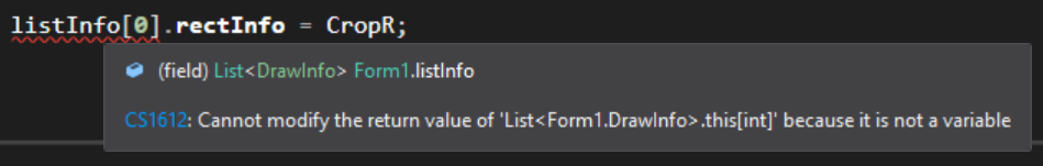 Cannot modify the return value of 'List<Form1.DrawInfo>.this[int]' because it is not a variable