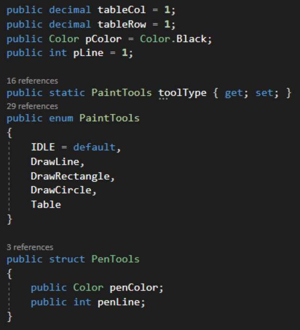 기존의 Rectangle과 PaintTools에 이어 표 그리기 포스팅에서 사용할 Col/Row 데이터와, 그림을 그릴 때의 Pen Color, Line굵기 정보를 같이 저장하도록 했습니다.
