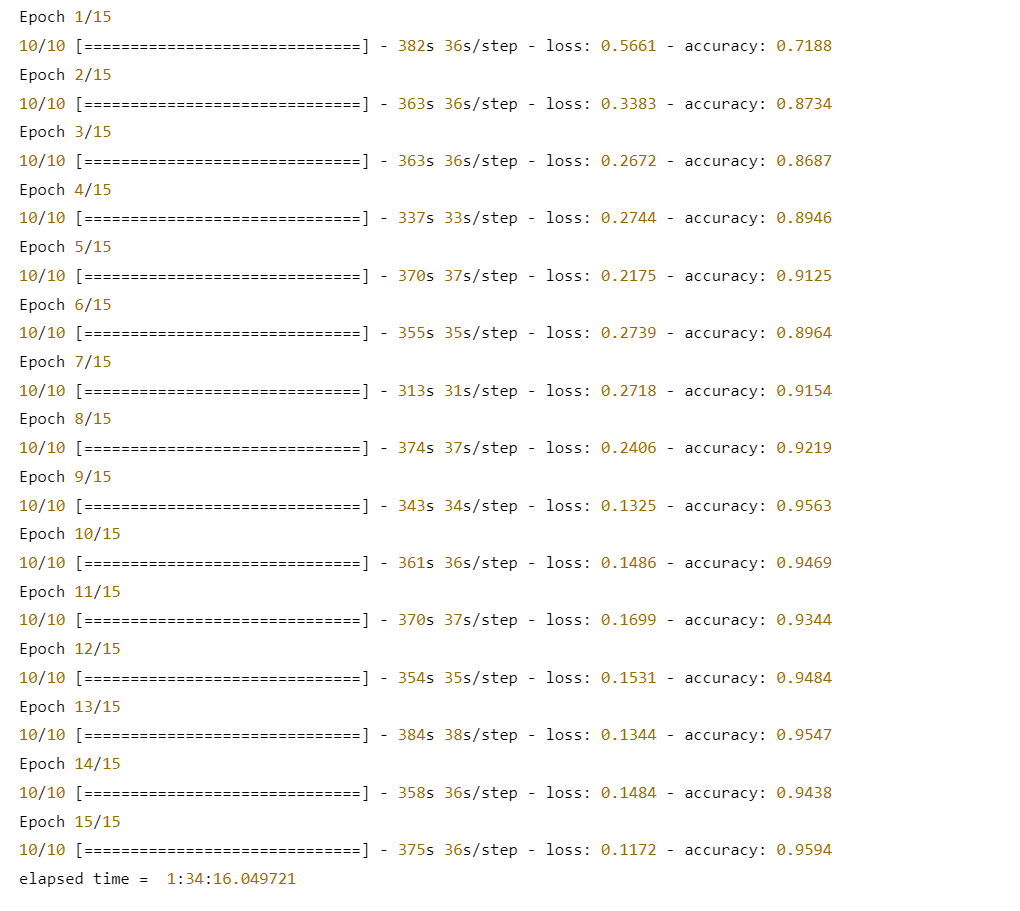 설계한 모델에 fit() 함수를 호출하면 ImageDataGenerator, flow_from_directory의 단계가 실질적으로 수행, 설정된 batch_size 만큼의 Numppy Array 데이터를 tensor로 바꾸고 설계한 모델의 인풋으로 입력되어 본격적인 학습을 시작.