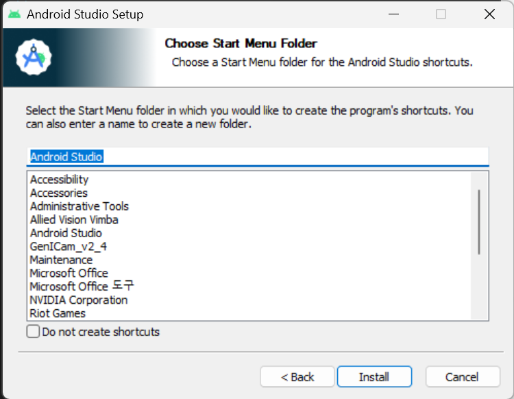 Do not create shortcuts 선택하면 바로가기 생성 없이 설치됩니다.