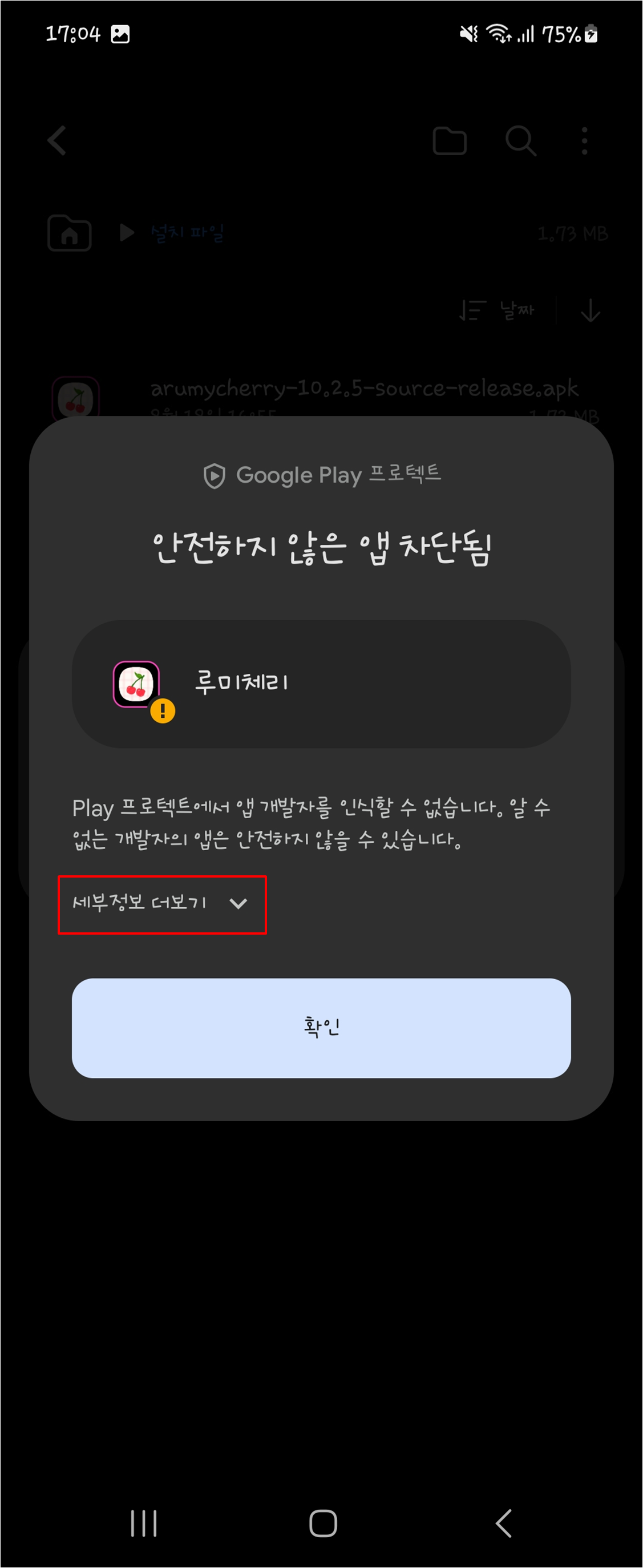 제가 만든 파일의 경우 구글 플레이에서 앱 개발자로 등록하지 않았기 때문에 위와 같은 알림이 뜹니다. 그치만 안전하니 안심하고 다운로드하셔도 됩니다.