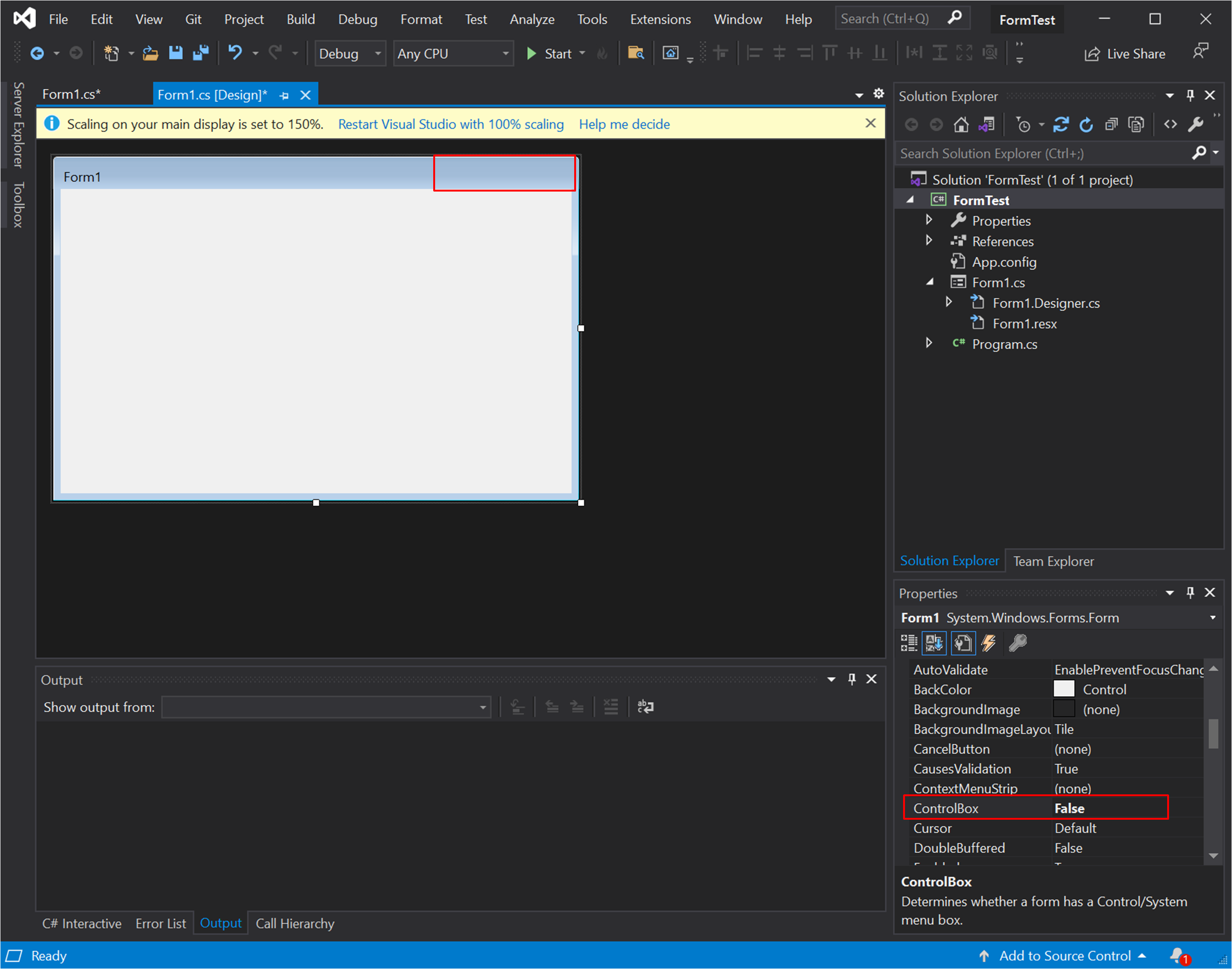 아래와 같이 ControlBox를 False 처리하면 최소화, 최대화 버튼도 사라지는 것을 알 수 있다.