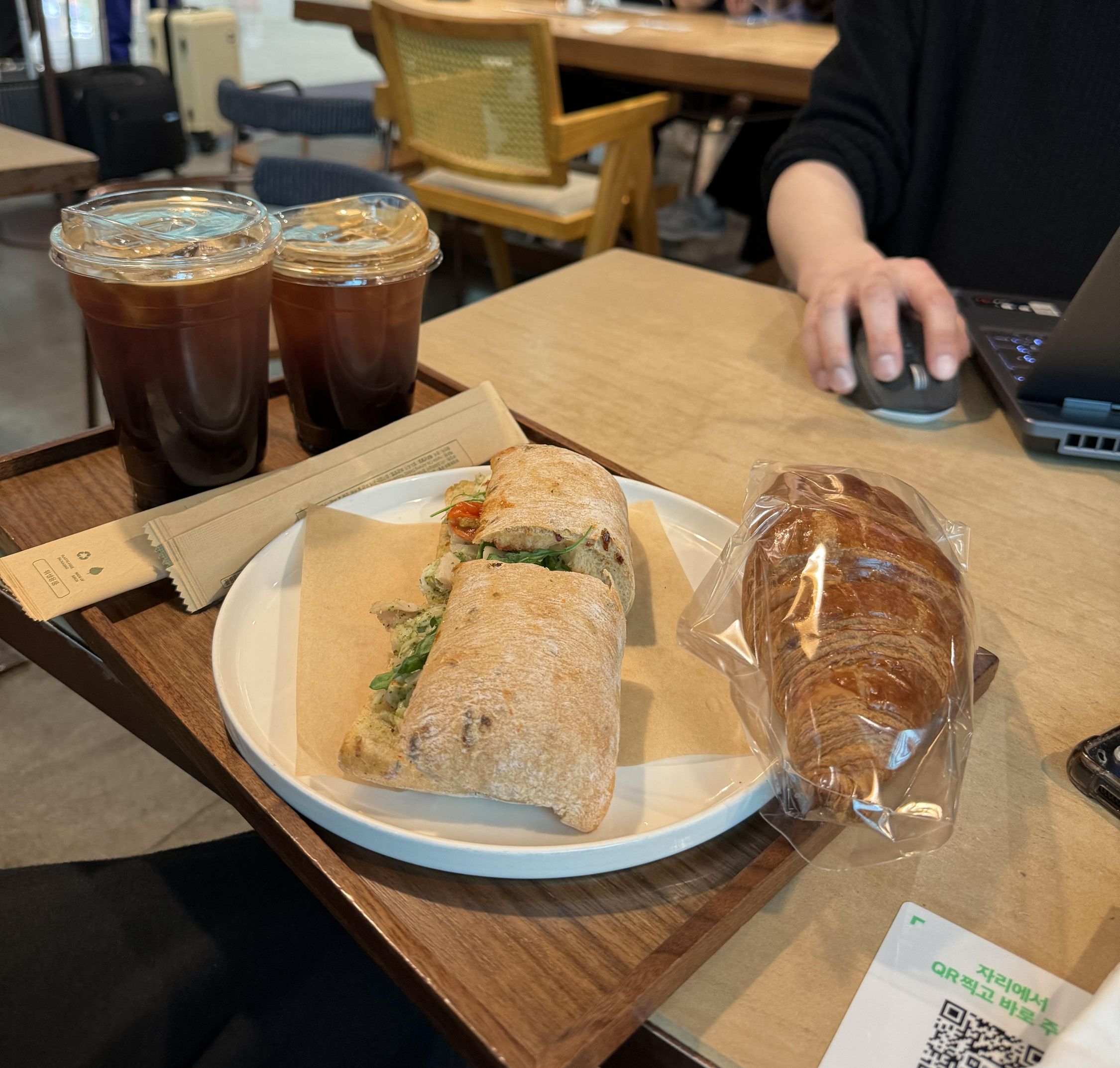 비행기 타기 전에 아침을 안 먹어서 간단하게 파니니랑 크로와상이랑 커피 마셨습니다.