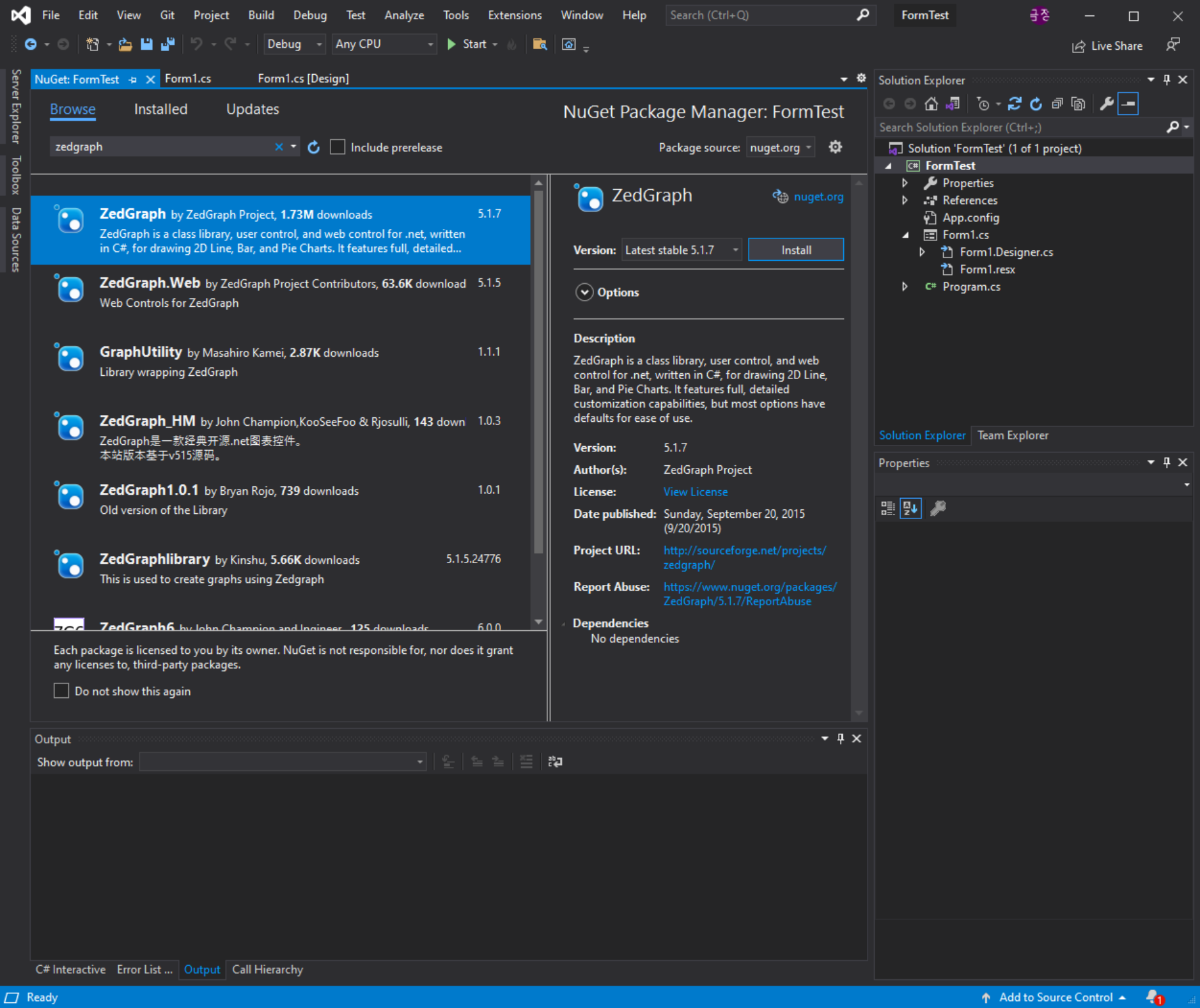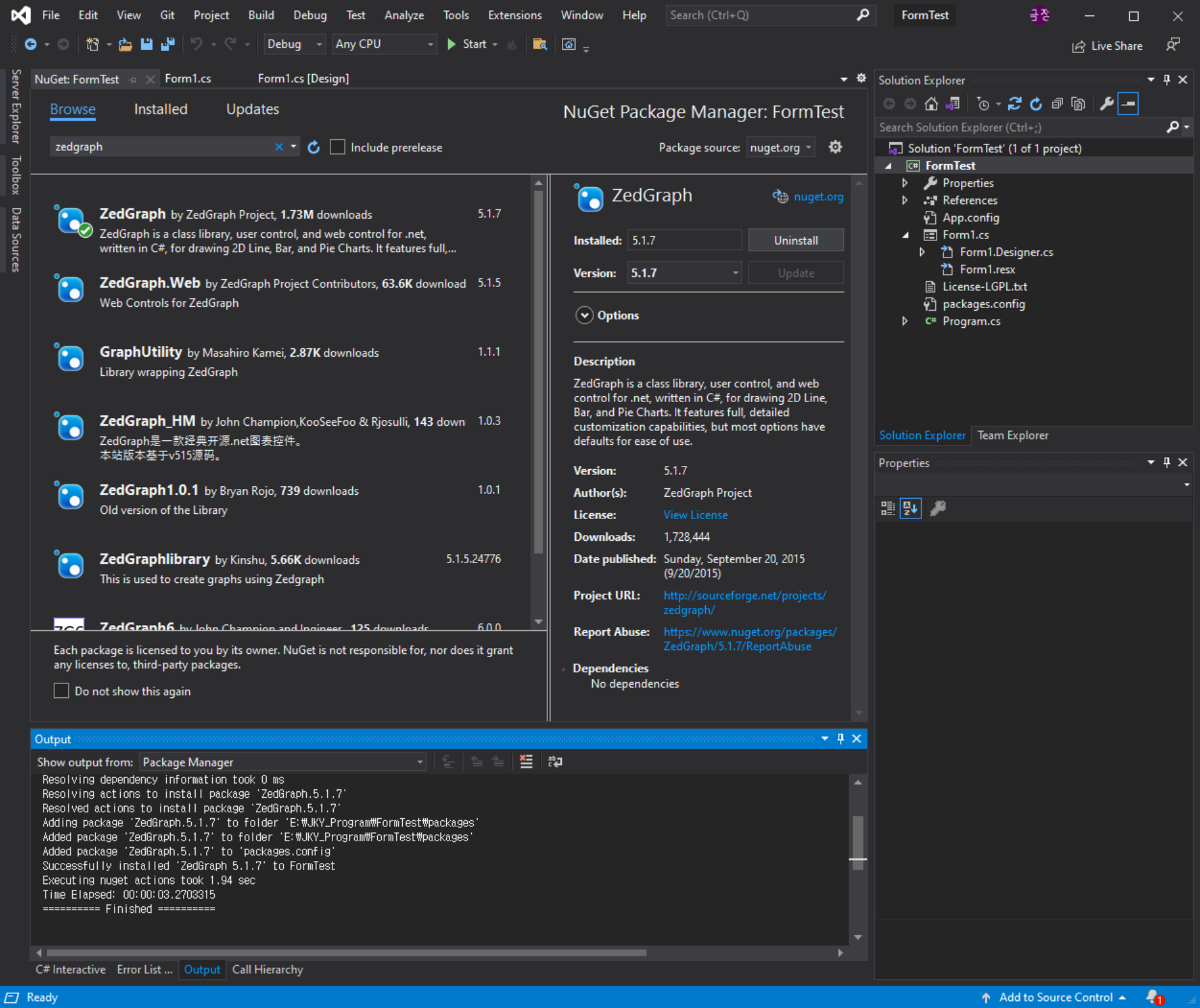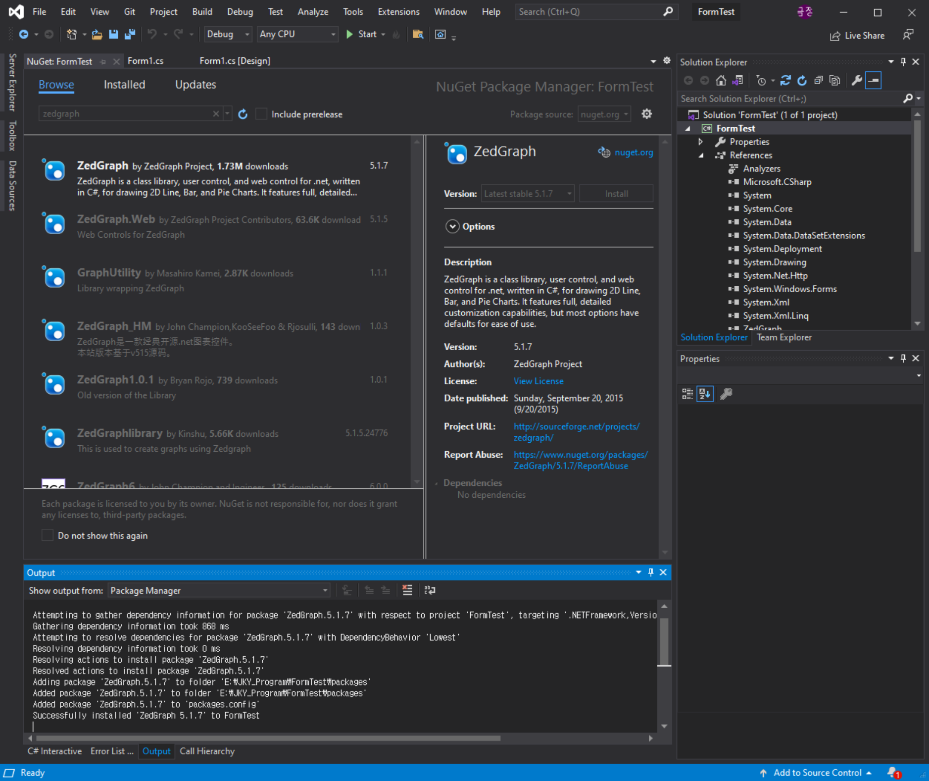 Browse > zedgraph 검색 후 하단 ZedGraph Install 버튼 클릭하여 설치