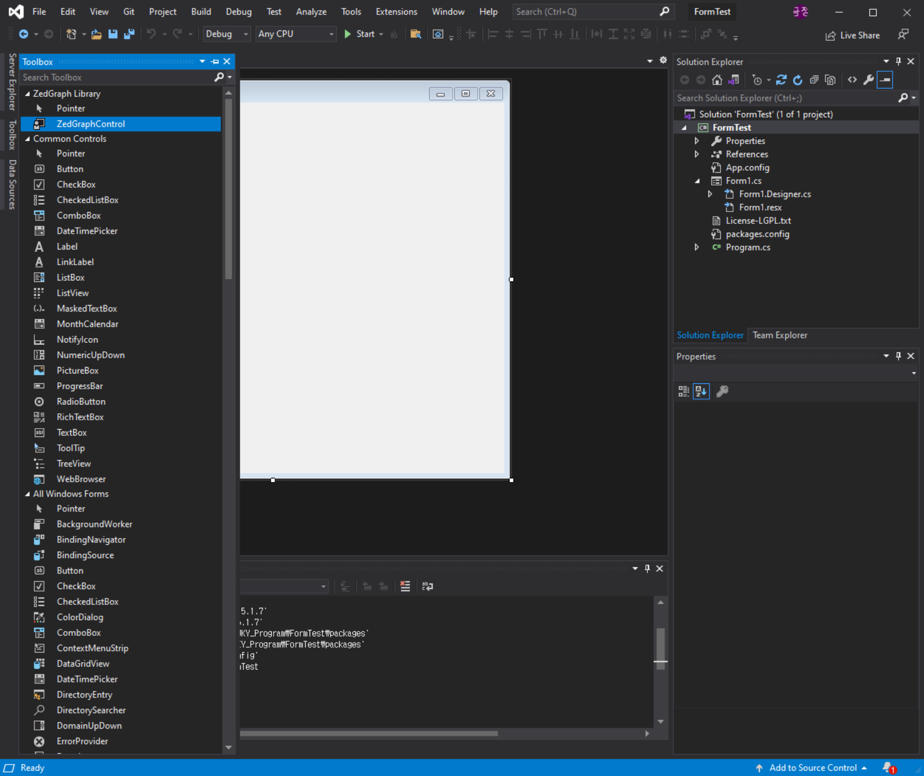 설치가 완료되면 도구상자 Toolbox에 ZedGraph Library가 추가되고, 하단에 ZedGraphControl을 이용하여 그래프를 그릴 수 있다.
