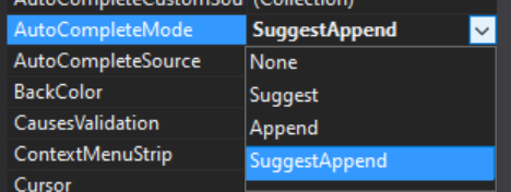 comboBox1.AutoCompleteMode = AutoCompleteMode.SuggestAppend;