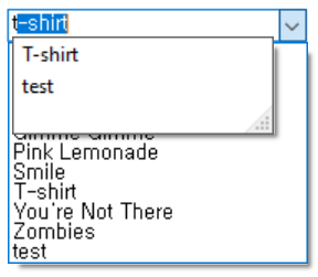 그리고 t를 입력하면 콤보박스에 T-shirt와 TEST 두 가지 경우가 있기 때문에 위와 같이 선택지가 T로 시작하는 아이템들로 정렬이 됩니다.