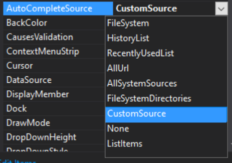 comboBox1.AutoCompleteSource = AutoCompleteSource.CustomSource;