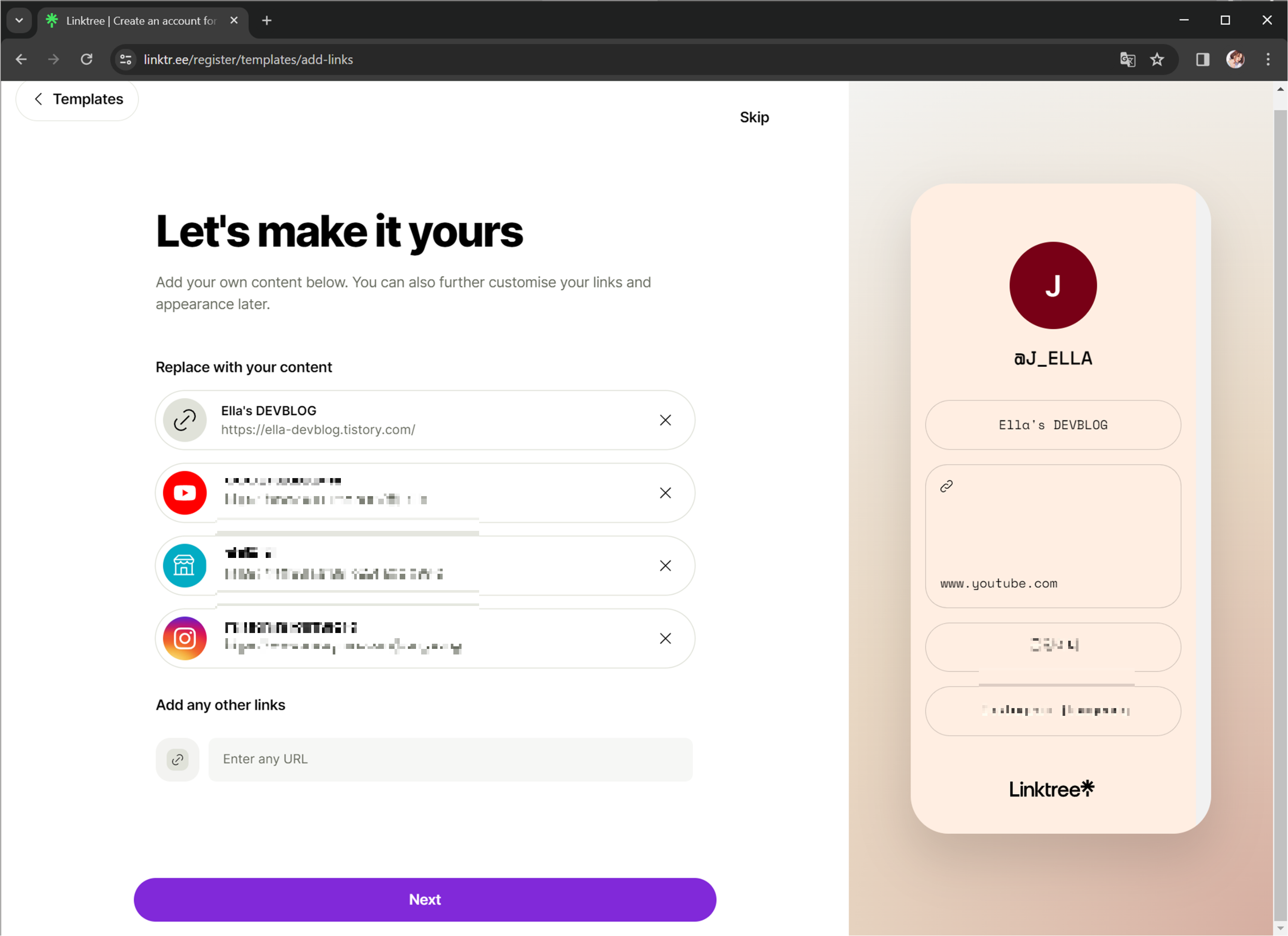 이제 본인의 링크를 입력하는 창이 나오는 데 여기도 일단 대충 입력해 줬습니다.