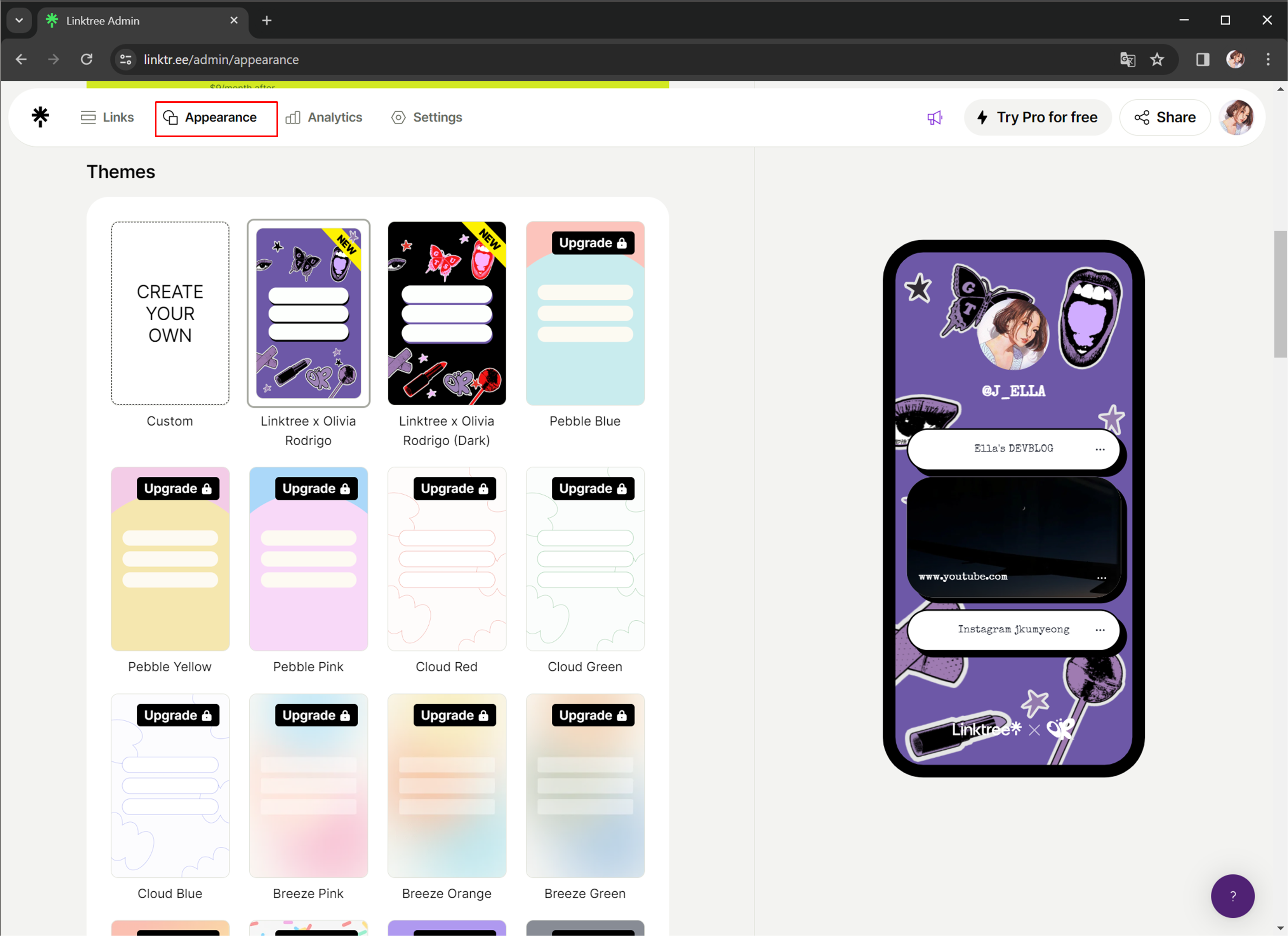 링크트리와 올리비아 로드리고가 콜라보를 한 테마가 무료네요!