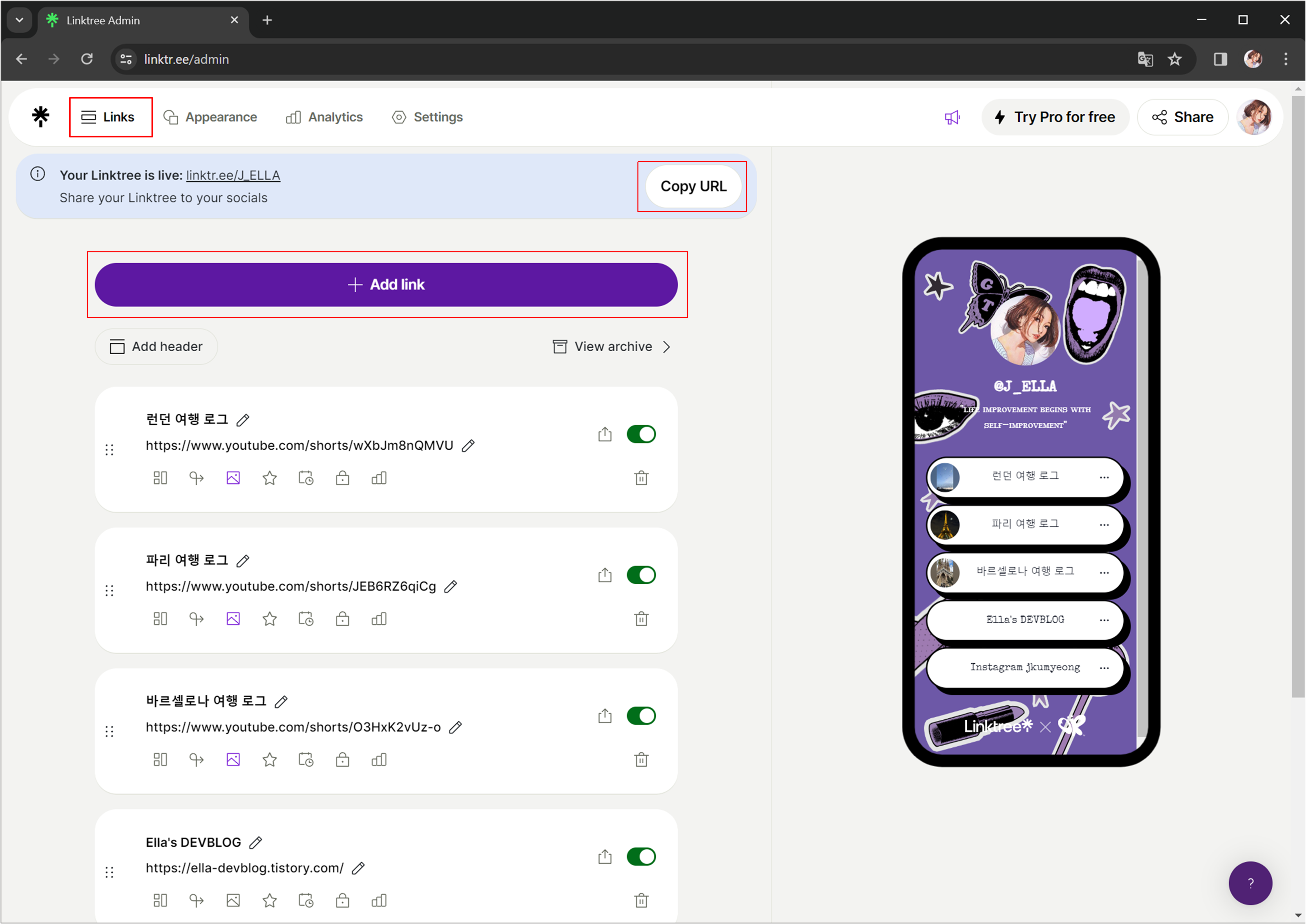 상단에 Copy URL을 클릭하면 본인 링크트리 URL이 복사됩니다!