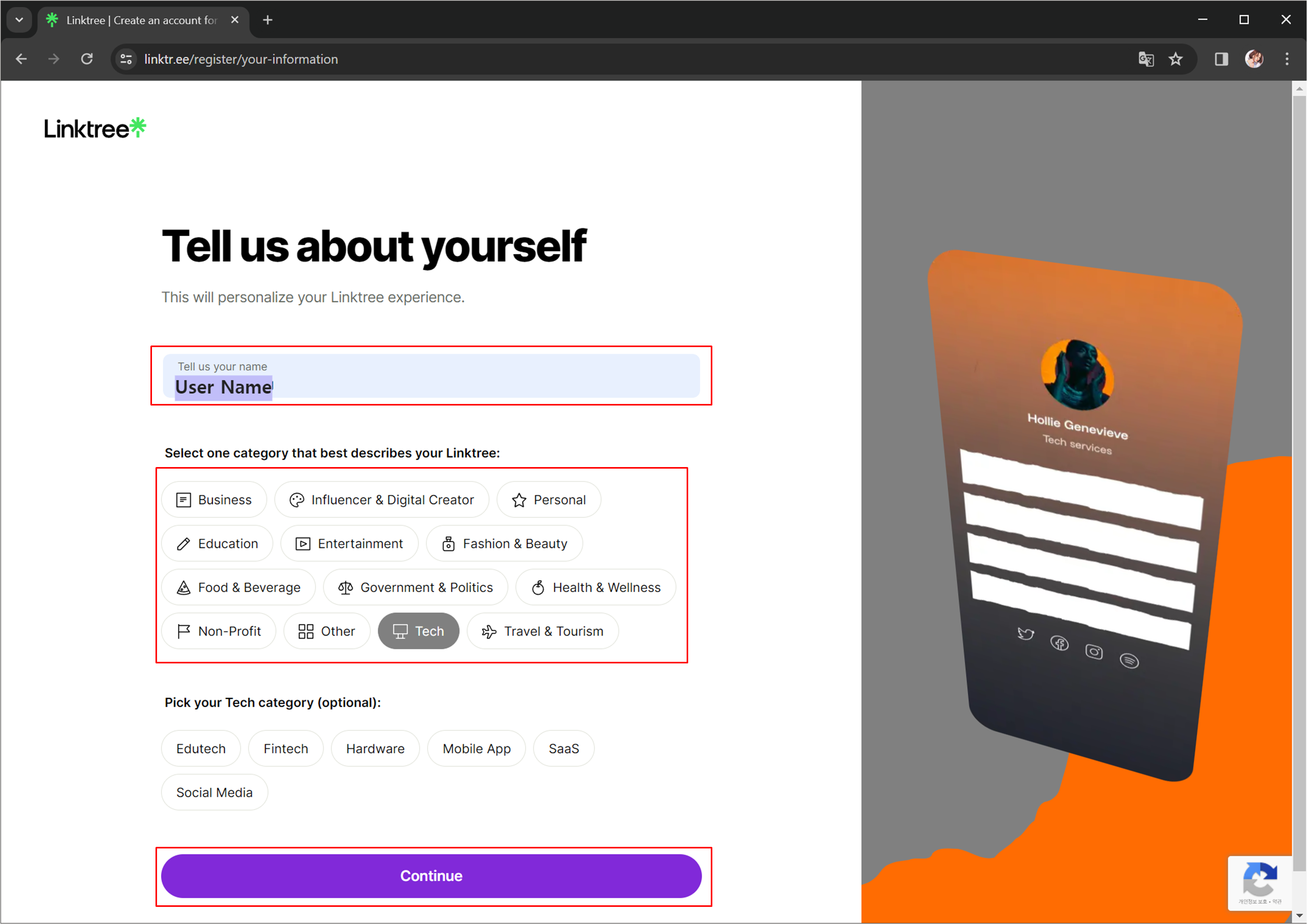 이름을 입력하면 본인의 링크를 제일 잘 나타내고 싶은 카테고리를 선택하면 됩니다.