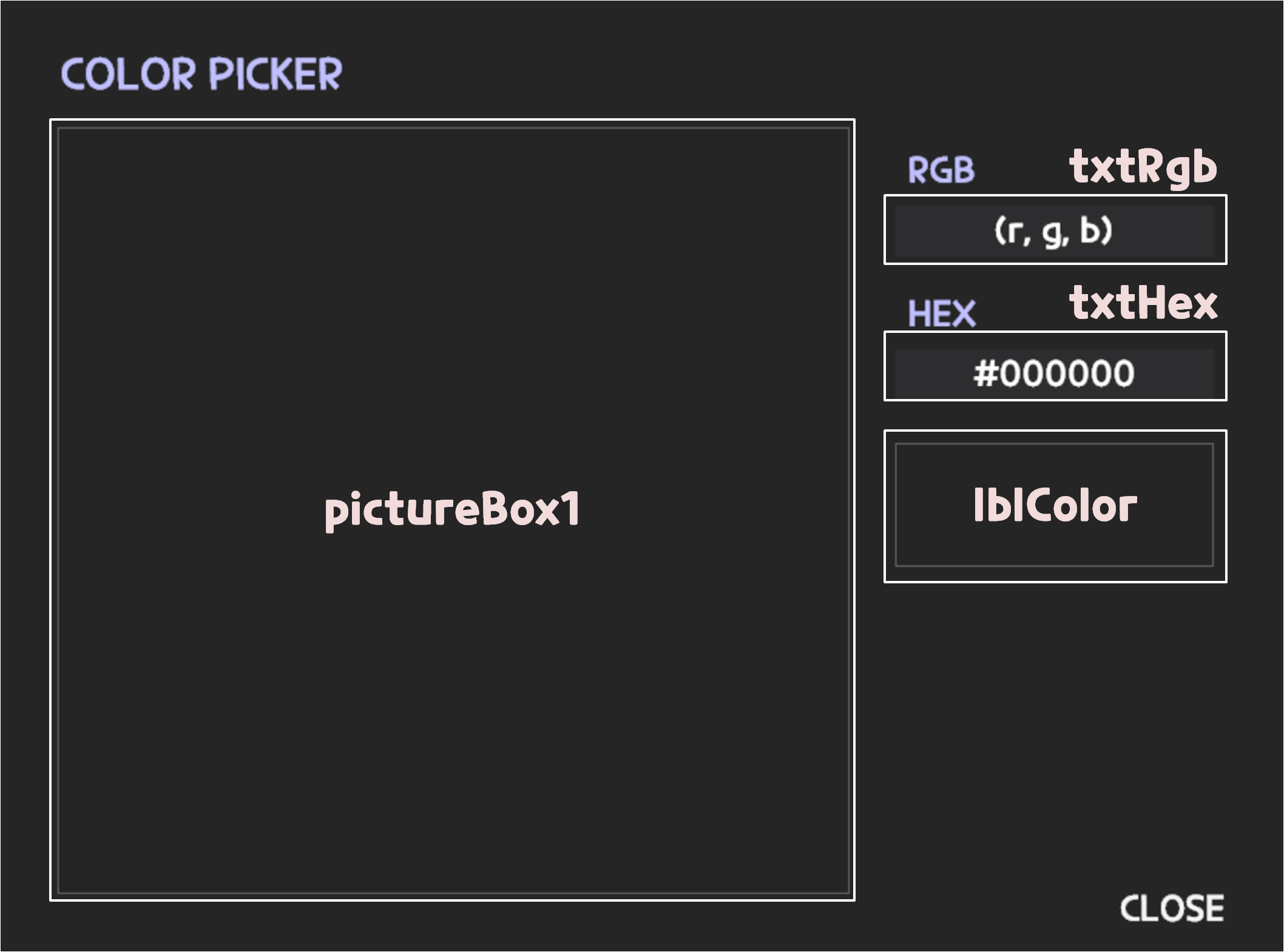 pictureBox1에 로드한 이미지에서 마우스 클릭 시 해당 포인트의 컬러를 lblColor의 배경색으로 변경해 주고, RGB 값과 HEX 값을 텍스트박스에 각각 입력해 주는 코드입니다.