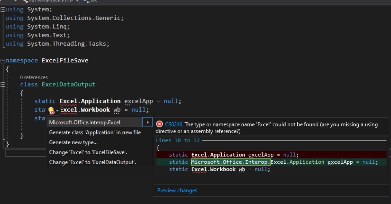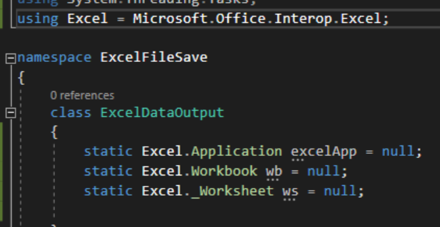 using Excel = Microsoft.Office.Interop.Excel; 과 같이 using 구문을 사용하여 간단하게 사용할 수도 있다.