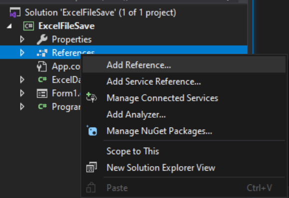 2024.03.14 - [IT/C#] - [C#] Excel 사용하기. Create Excel File + Update Excel File [C#] Excel 사용하기. Create Excel File + Update Excel File [ C# Excel 사용하기 ] 1. 참조 추가하기 * 해당 PC에 Excel이 설치되어 있어야 하며, 엑