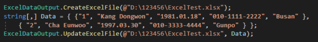 ExcelDataOutput.cs 파일을 생성하여 엑셀파일 생성과 업데이트를 해준다. (주석 참고)