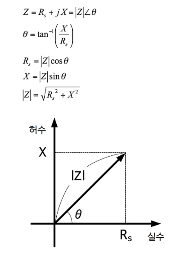 : 임피던스 Z는 실수부(Rs)와 허수부(X)로 구성되어 있으며 복소 평면 상에 전개하면 각 파라미터값을 구할 수 있다.