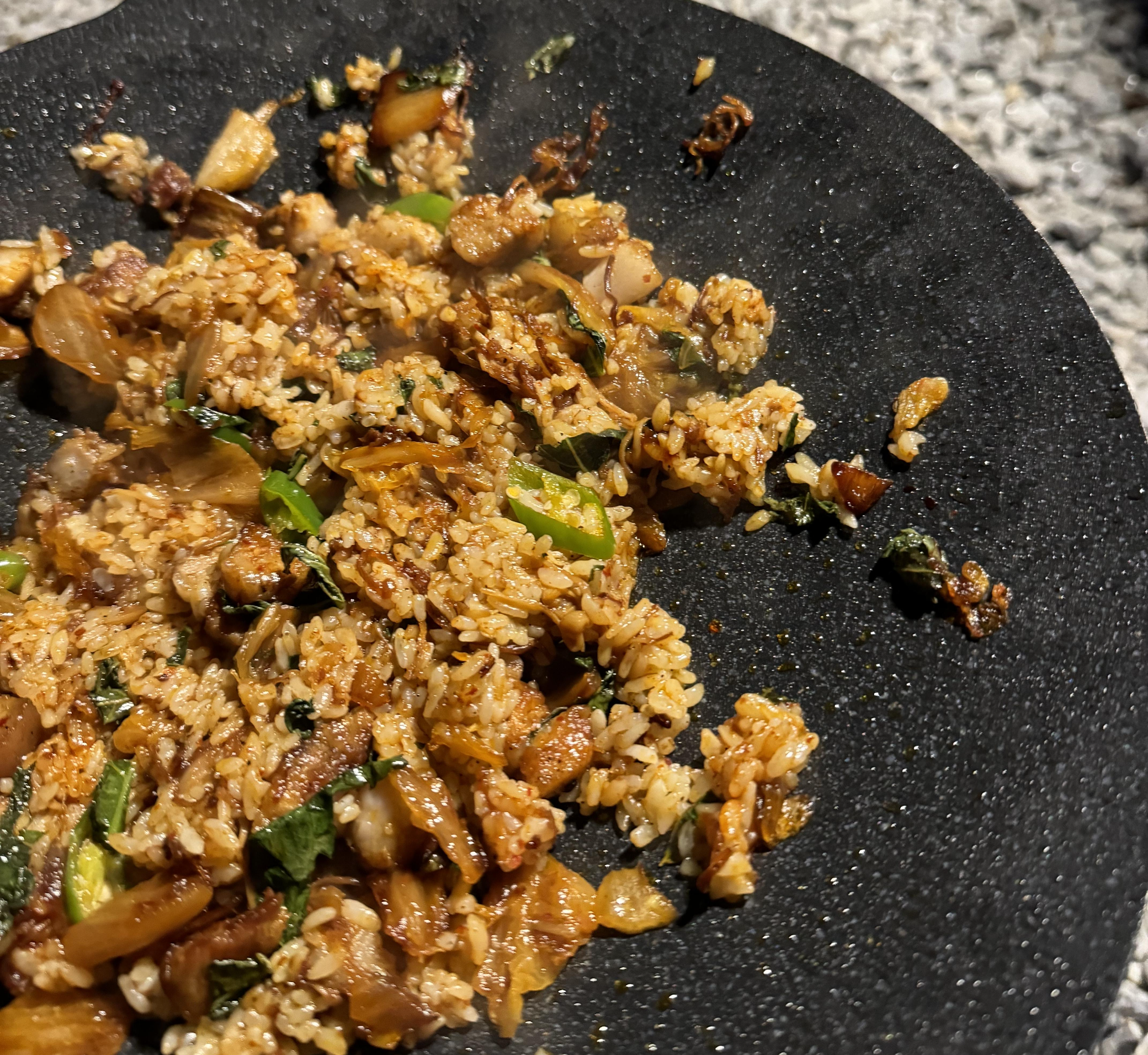 남은 고기 잘게 잘라서 밥 넣고, 김치 넣고, 땡초 넣고, 깻잎까지 야무지게 넣어서 먹기.