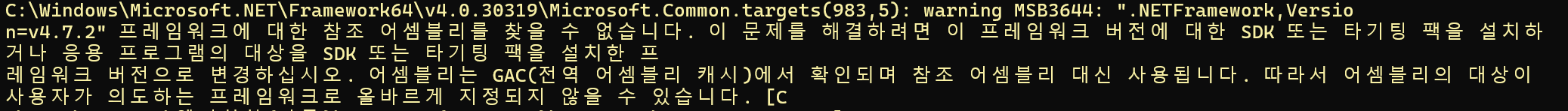 C:\Windows\Microsoft.NET\Framework64\v4.0.30319\Microsoft.Common.targets(983,5): warning MSB3644: ".NETFramework,Version=v4.7.2" ํ๋ ์์ํฌ์ ๋ํ ์ฐธ์กฐ ์ด์ ๋ธ๋ฆฌ๋ฅผ ์ฐพ์ ์ ์์ต๋๋ค. ์ด ๋ฌธ์ ๋ฅผ ํด๊ฒฐํ๋ ค๋ฉด ์ด ํ๋ ์์ํฌ ๋ฒ์ ์ ๋ํ SDK ๋๋ ํ๊ธฐํ ํฉ์ ์ค์นํ๊ฑฐ๋ ์์ฉ ํ๋ก๊ทธ๋จ์ ๋์์ SDK ๋๋ ํ๊ธฐํ ํฉ์ ์ค์นํ ํ๋ ์์ํฌ ๋ฒ์ ์ผ๋ก ๋ณ๊ฒฝํ์ญ์์ค. ์ด์ ๋ธ๋ฆฌ๋ GAC(์ ์ญ ์ด์ ๋ธ๋ฆฌ ์บ์)์์ ํ์ธ๋๋ฉฐ ์ฐธ์กฐ ์ด์ ๋ธ๋ฆฌ ๋์ ์ฌ์ฉ๋ฉ๋๋ค. ๋ฐ๋ผ์ ์ด์ ๋ธ๋ฆฌ์ ๋์์ด ์ฌ์ฉ์๊ฐ ์๋ํ๋ ํ๋ ์์ํฌ๋ก ์ฌ๋ฐ๋ฅด๊ฒ ์ง์ ๋์ง ์์ ์ ์์ต๋๋ค. [C:\๊ฒฝ๋ก...]