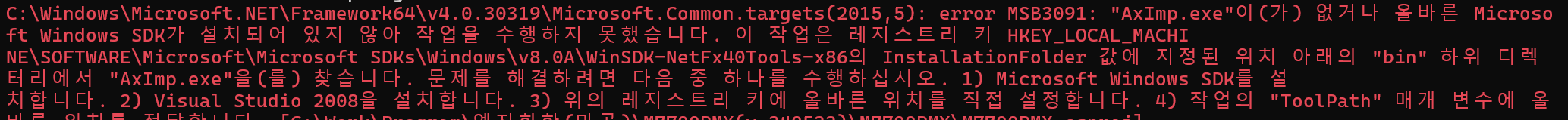 C:\Windows\Microsoft.NET\Framework64\v4.0.30319\Microsoft.Common.targets(2015,5): error MSB3091: "AxImp.exe"์ด(๊ฐ) ์๊ฑฐ๋ ์ฌ๋ฐ๋ฅธ Microsoft Windows SDK๊ฐ ์ค์น๋์ด ์์ง ์์ ์์ ์ ์ํํ์ง ๋ชปํ์ต๋๋ค. ์ด ์์ ์ ๋ ์ง์คํธ๋ฆฌ ํค HKEY_LOCAL_MACHINE\SOFTWARE\Microsoft\Microsoft SDKs\Windows\v8.0A\WinSDK-NetFx40Tools-x86์ InstallationFolder ๊ฐ์ ์ง์ ๋ ์์น ์๋์ "bin" ํ์ ๋๋ ํฐ๋ฆฌ์์ "AxImp.exe"์(๋ฅผ) ์ฐพ์ต๋๋ค. ๋ฌธ์ ๋ฅผ ํด๊ฒฐํ๋ ค๋ฉด ๋ค์ ์ค ํ๋๋ฅผ ์ํํ์ญ์์ค. 1) Microsoft Windows SDK๋ฅผ ์ค์นํฉ๋๋ค. 2) Visual Studio 2008์ ์ค์นํฉ๋๋ค. 3) ์์ ๋ ์ง์คํธ๋ฆฌ ํค์ ์ฌ๋ฐ๋ฅธ ์์น๋ฅผ ์ง์ ์ค์ ํฉ๋๋ค. 4) ์์ ์ "ToolPath" ๋งค๊ฐ ๋ณ์์ ์ฌ๋ฐ๋ฅธ ์์น๋ฅผ ์ ๋ฌํฉ๋๋ค.