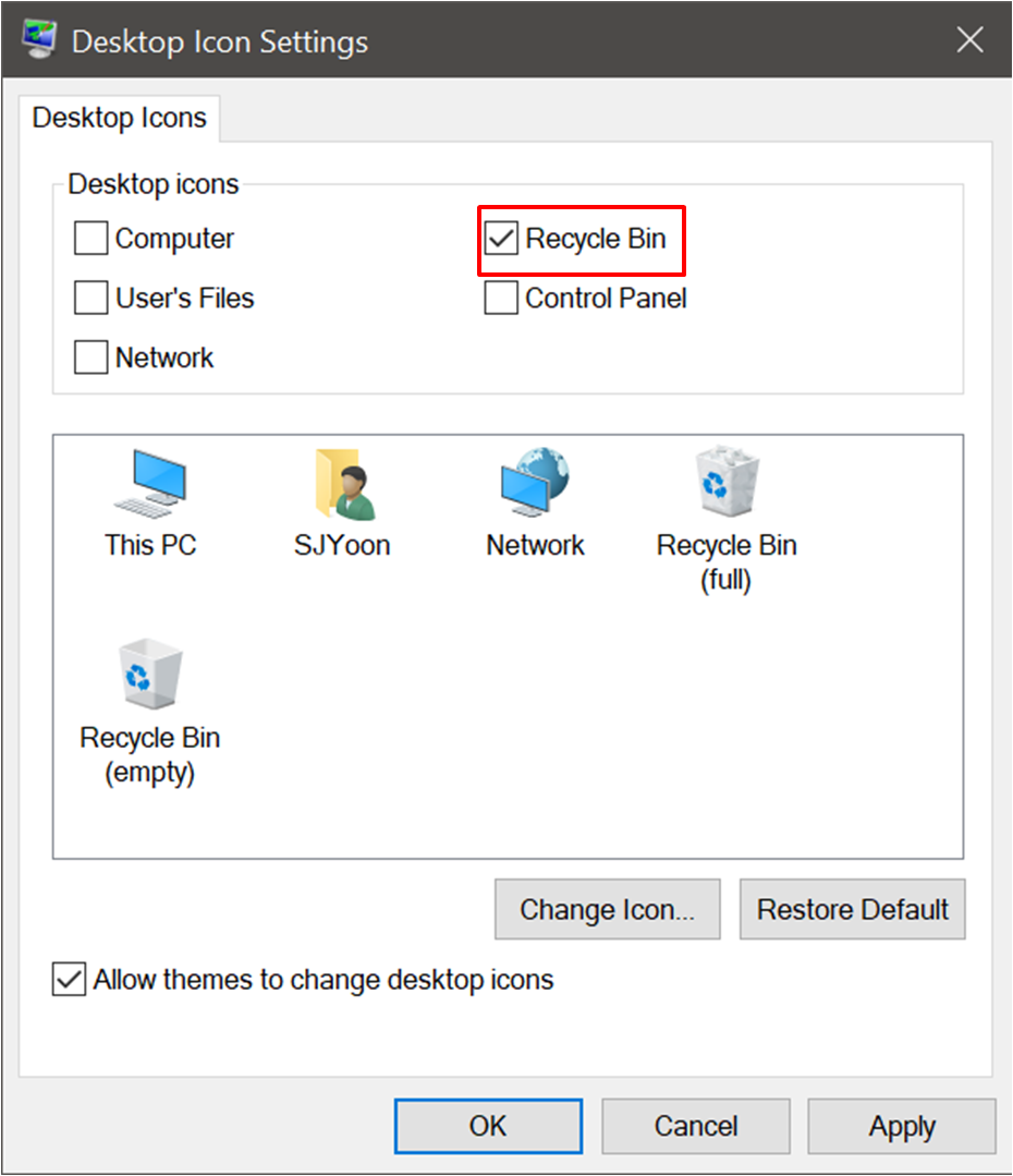 체크 해제 하면 휴지통 아이콘이 표시되지 않습니다.