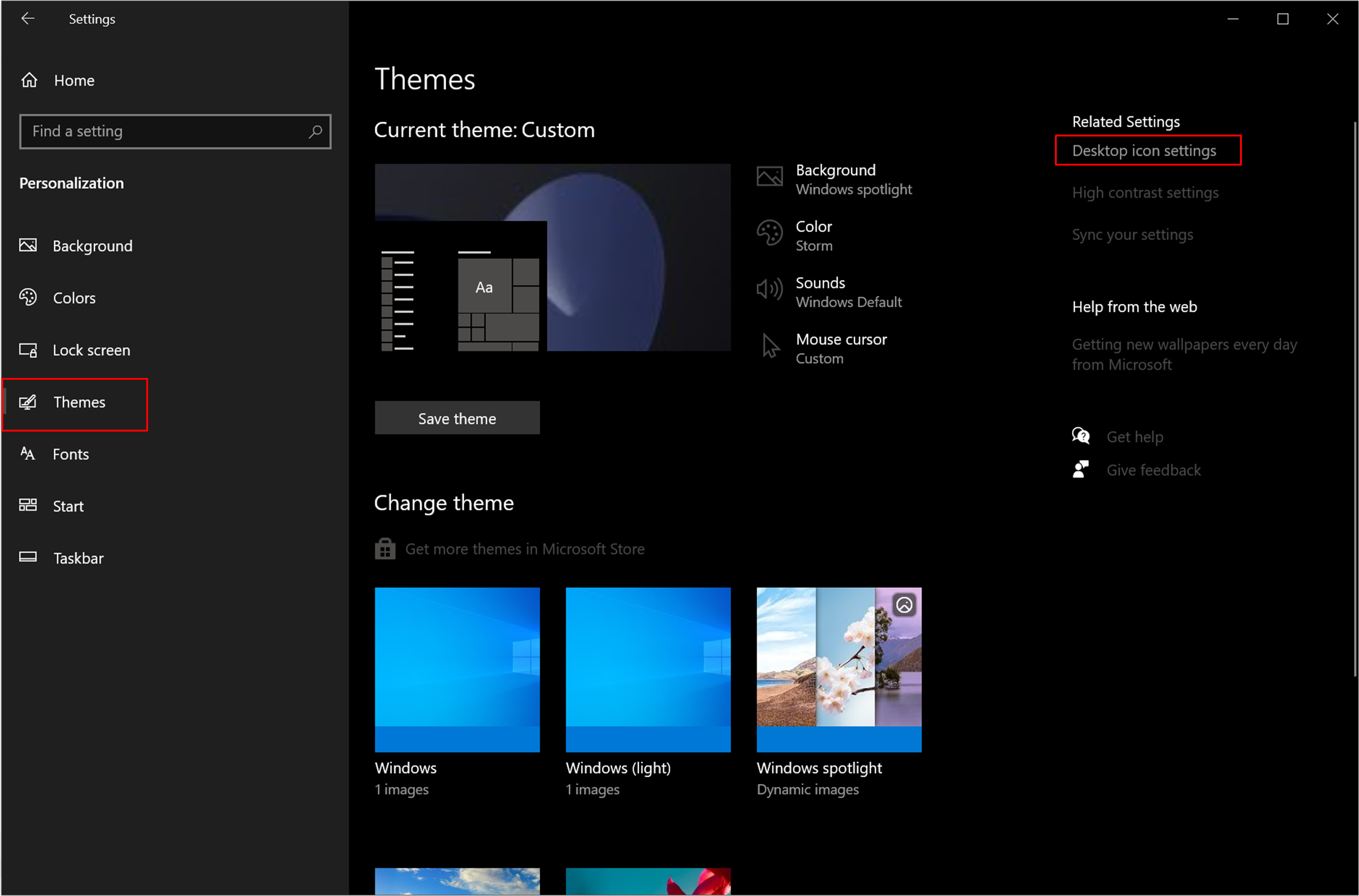 Settings > Personalization > Themes > Desktop icon settings