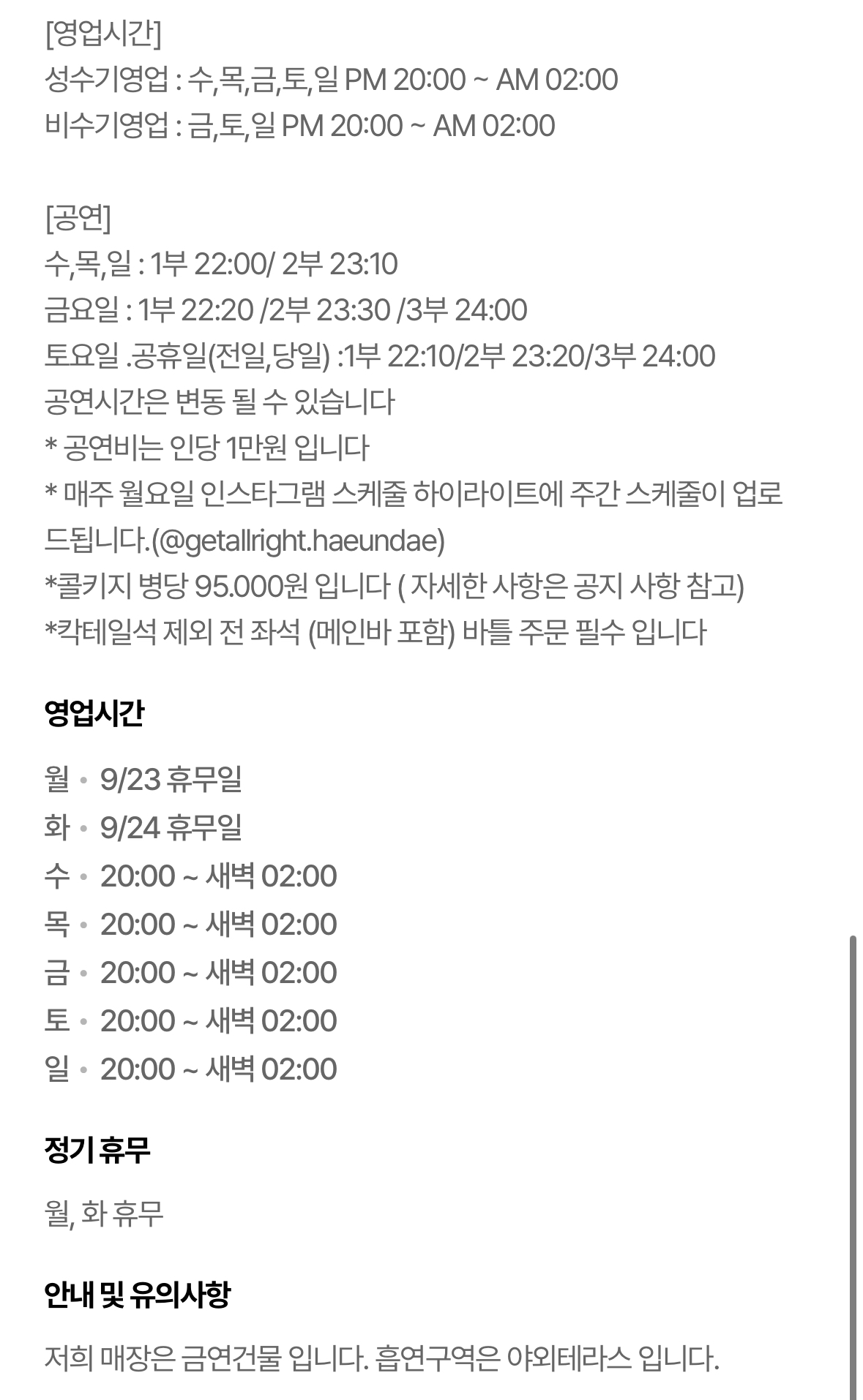 매장 영업시간 및 공연 안내 사항 참고하세요 :)